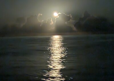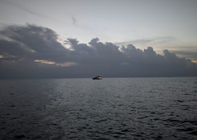 In der Nacht haben wir eine unangenehme Begegnung. Und zwar höre ich kurz vor 1 Uhr komische Geräusche am Rumpf und schaue mal zum Fenster raus. Tatsächlich ist da eine Gestalt, die sich an irgendwas unter dem Tenderlift zu schaffen macht. Sofort wecke ich Thomas und wir gehen mit Taschenlampen bewaffnet raus. Der Dieb, wir nehmen an es ist einer, ist natürlich nicht mehr zu sehen. Bis wir dann unter’s Schiff leuchten. Dort versteckt er sich. Nach wütenden Zurufen macht er sich dann mit seinem Kanu schleunigst aus dem Staub.