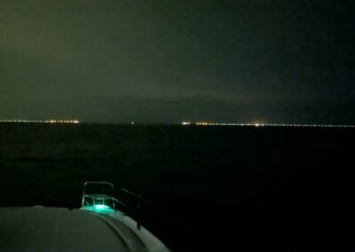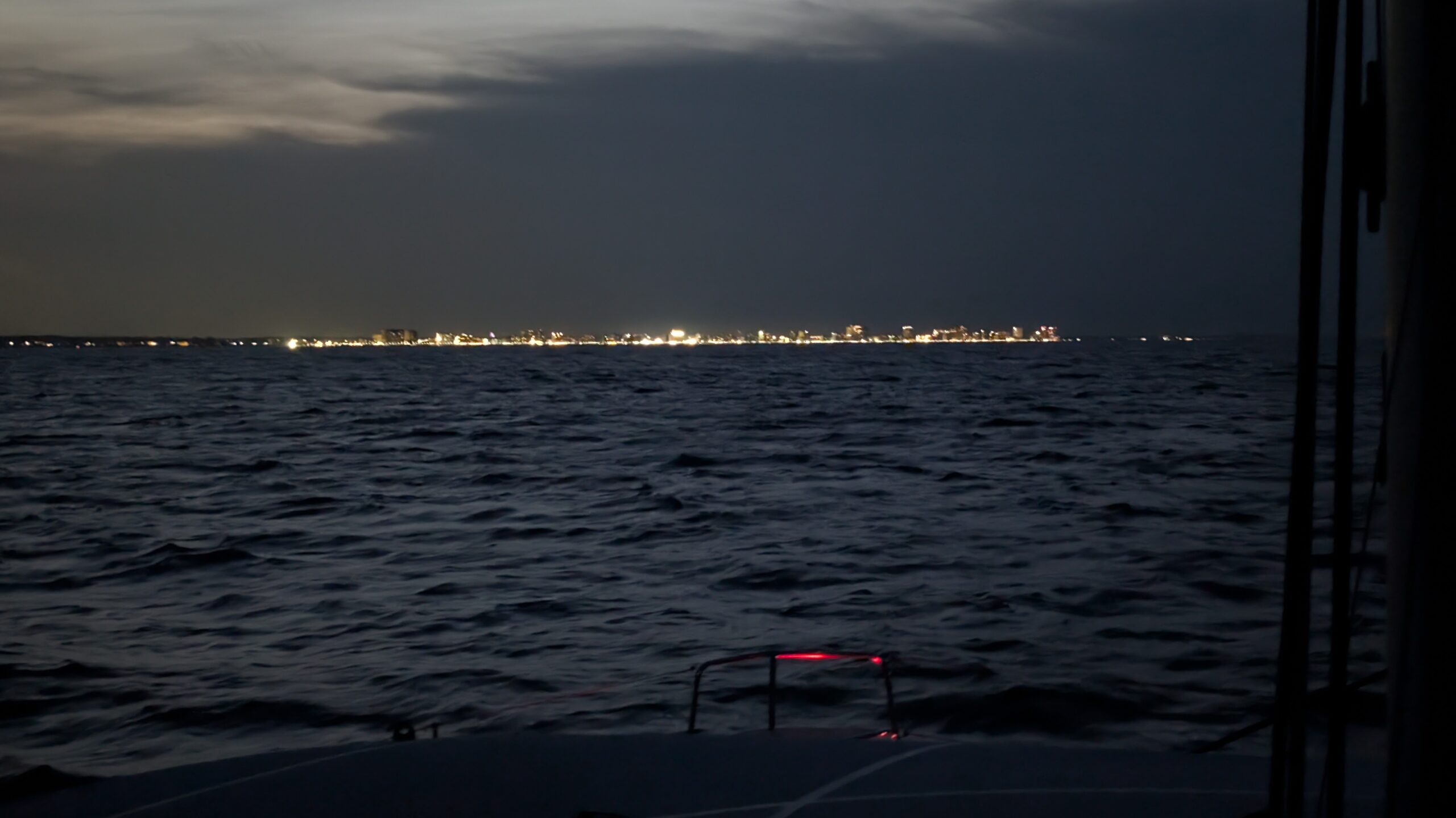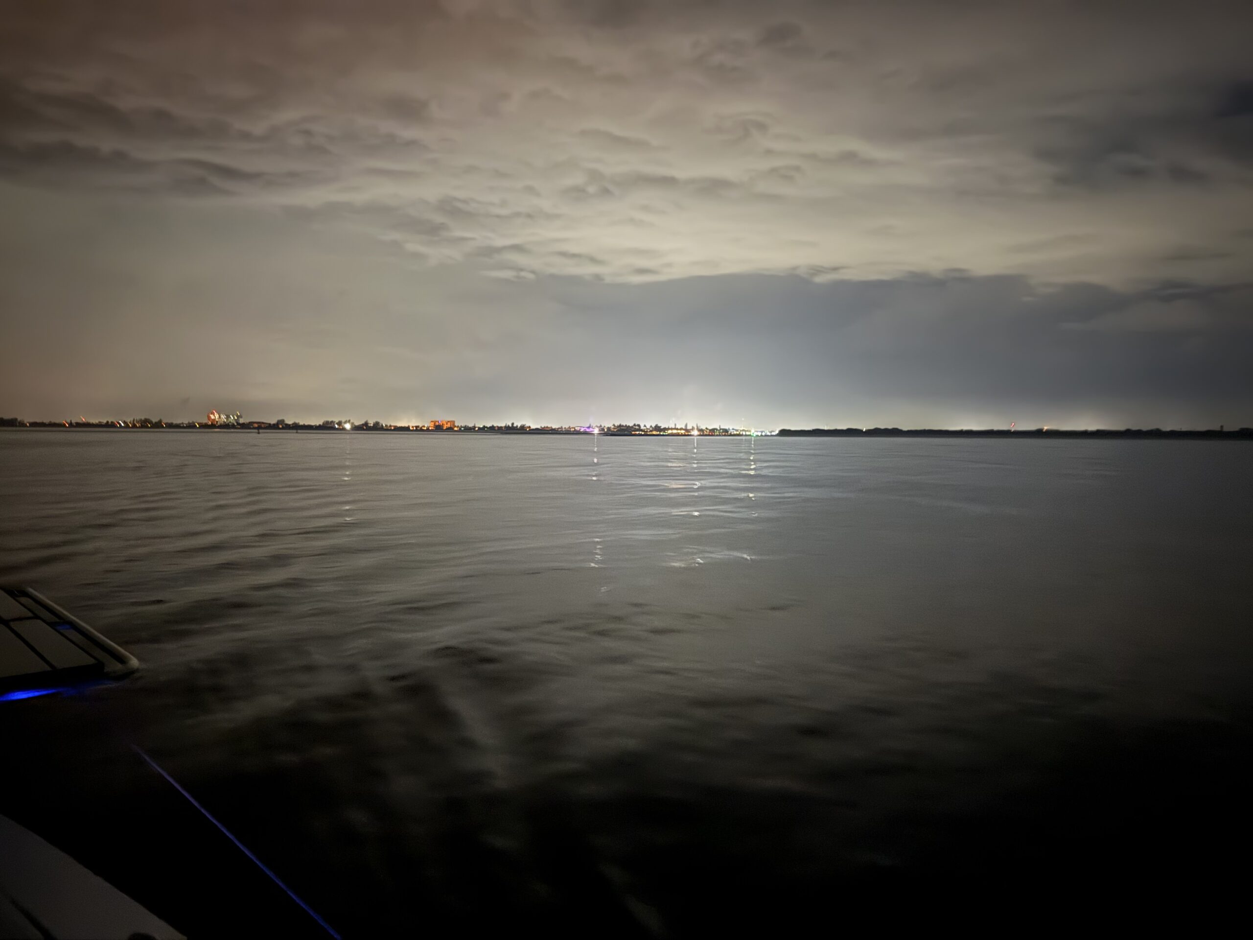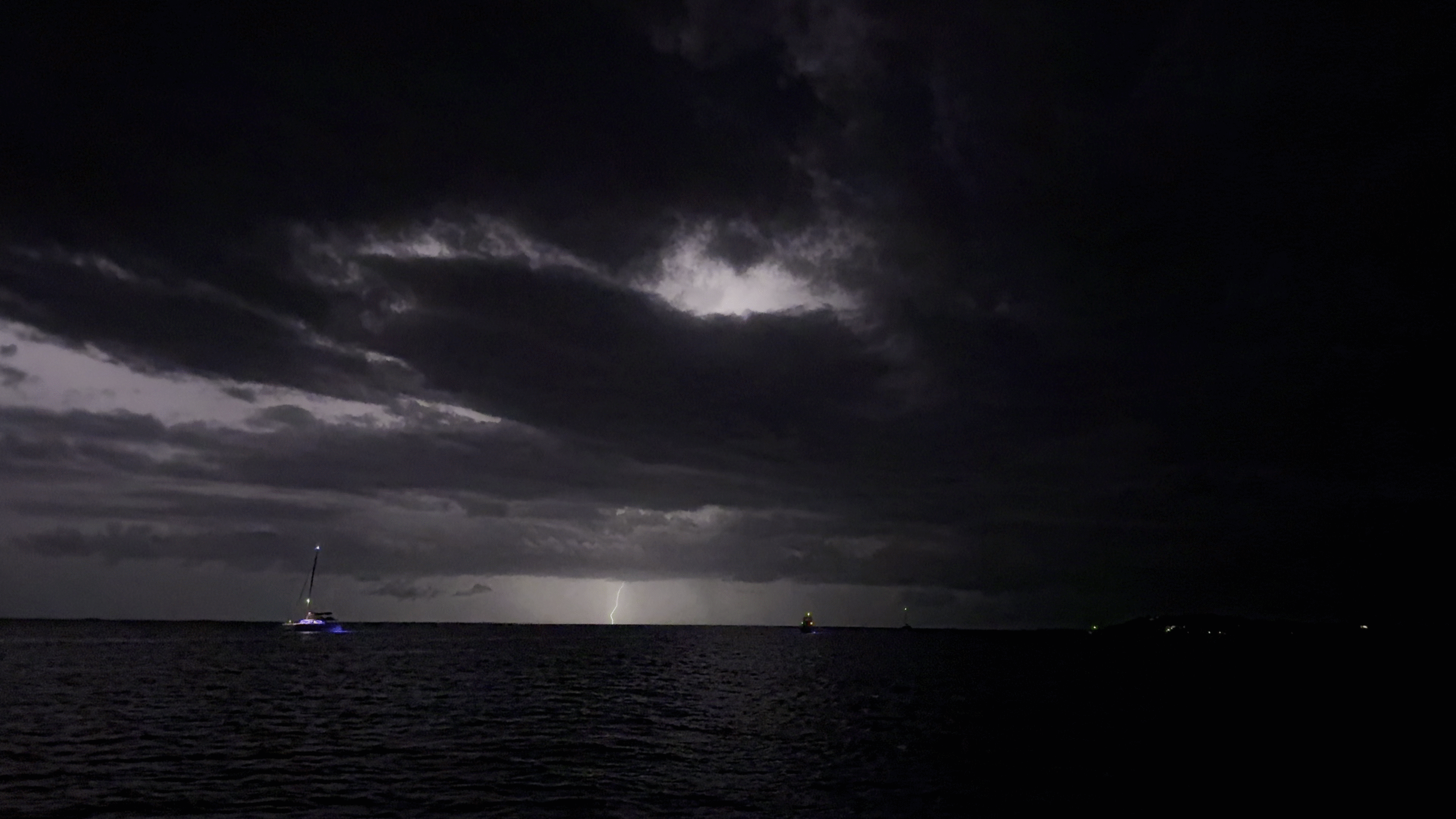 Kurz nach Mitternacht, als wir auf dem Weg zur Marina sind, ändert das riesige Gewitter seine Richtung und kommt auf uns zu. 😑