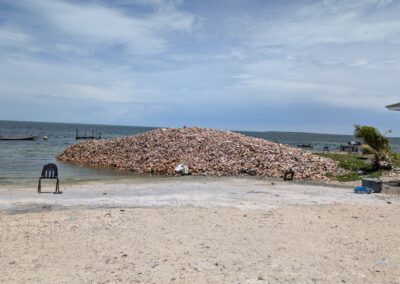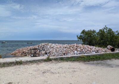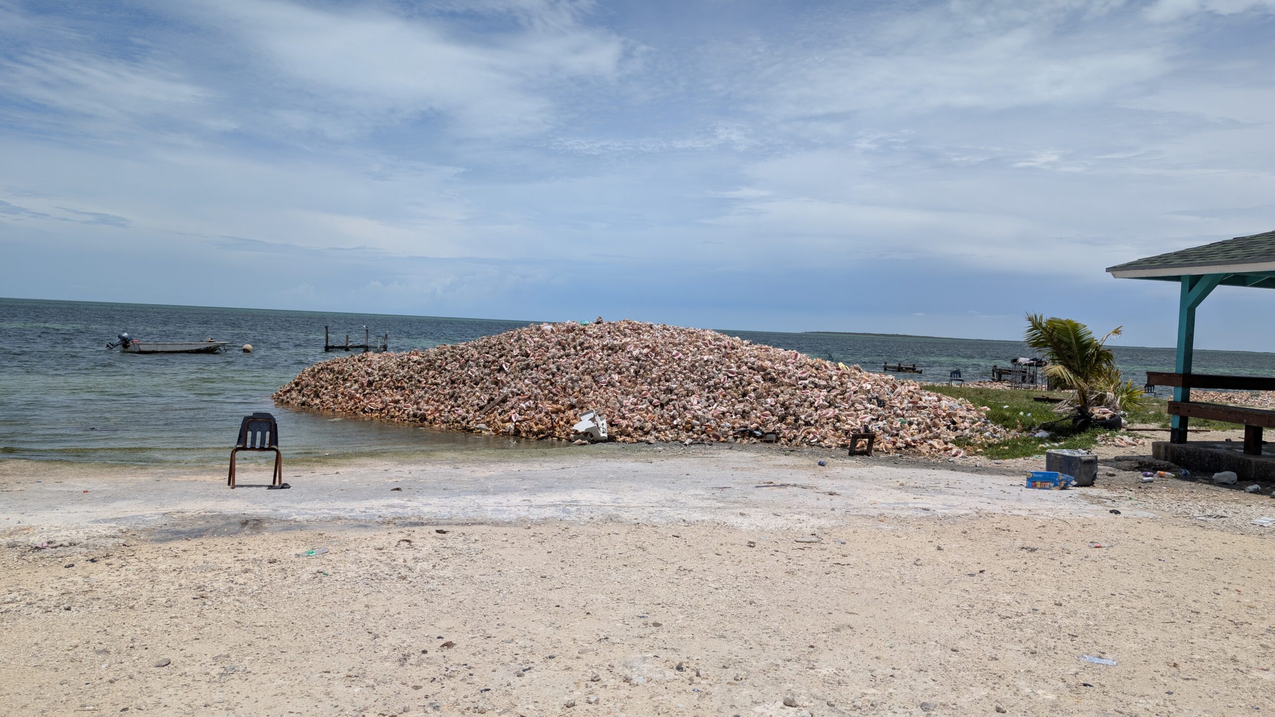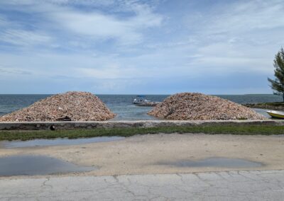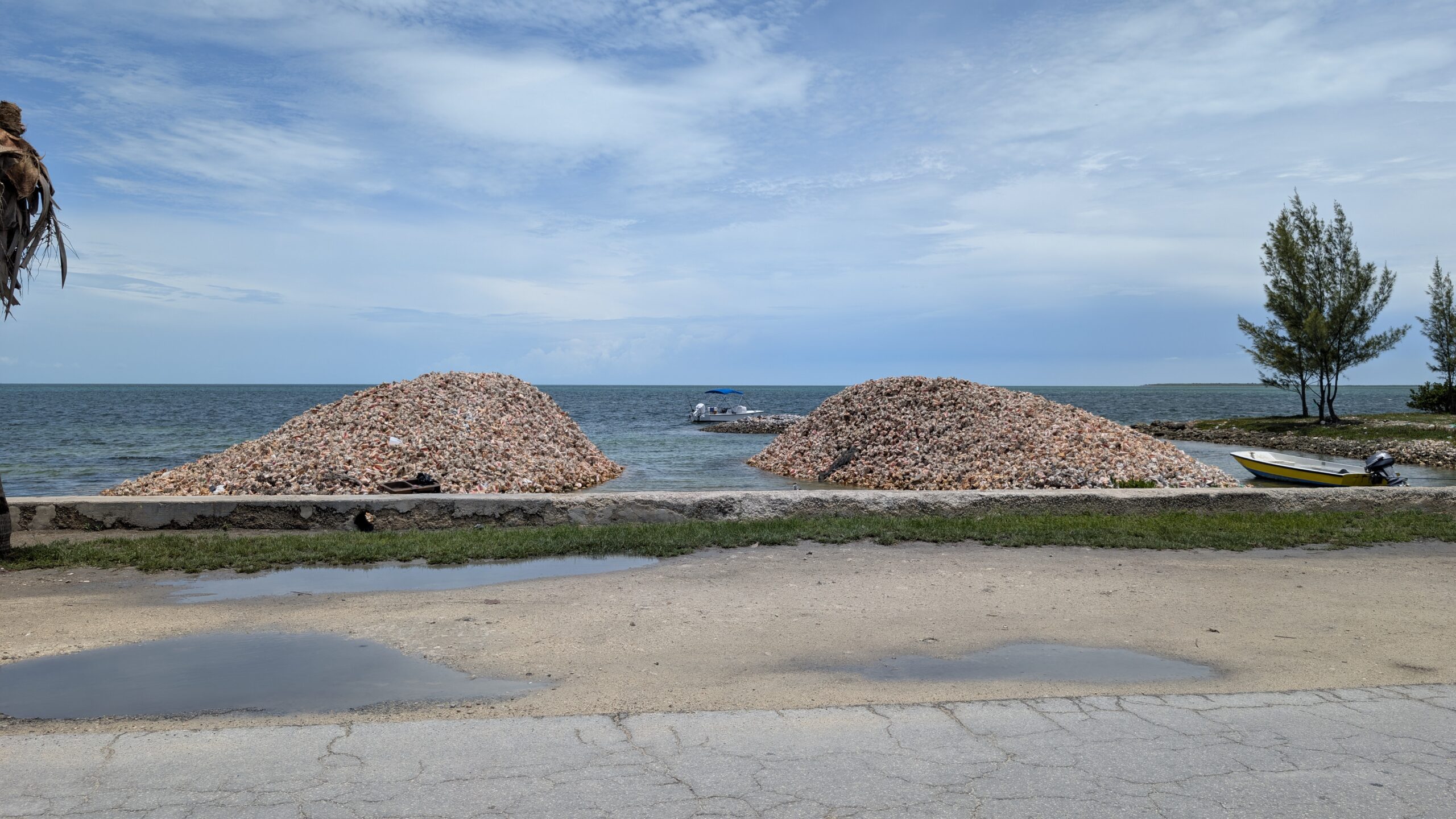 Wir fahren nach Freeport. Was ca. 50 Minuten dauert. Ausserhalb der Marina ist fast alles sehr heruntergekommen. Vieles noch kaputt. Am Ufer des Meeres liegen Berge von Conch-Muscheln. Da fragt man sich, ob es hier überhaupt noch Conch gibt. 😨