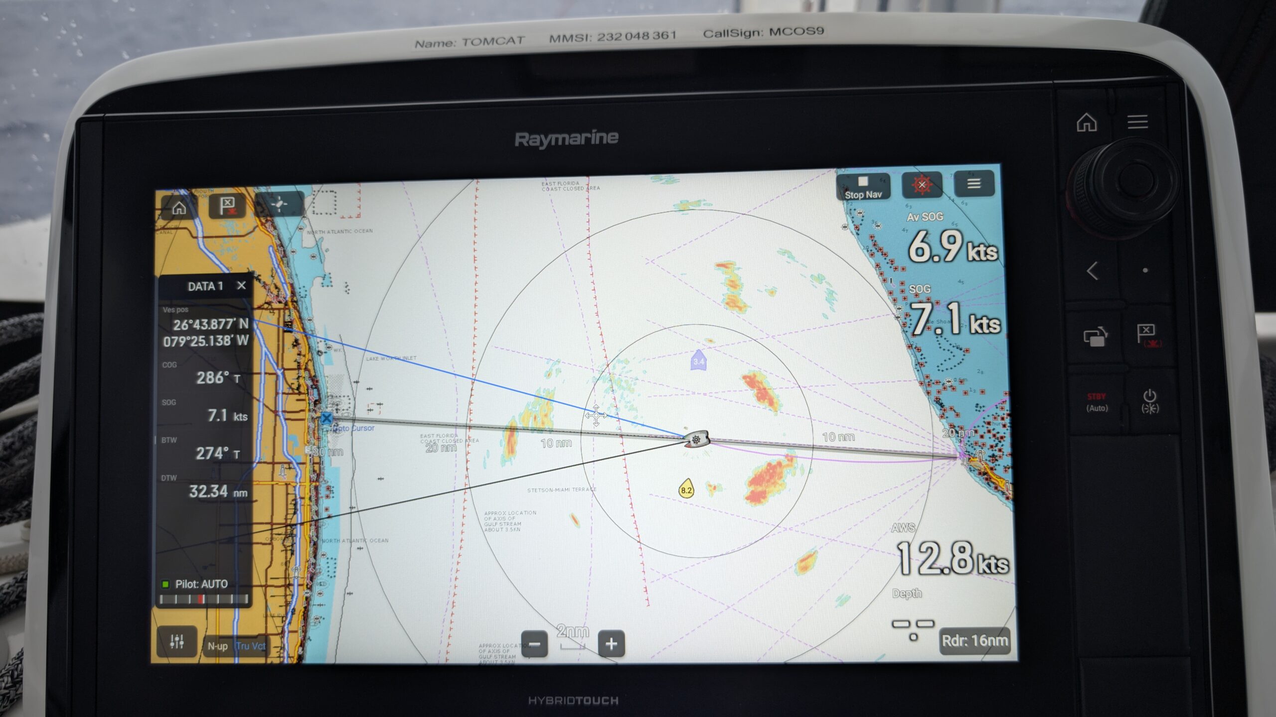 Der Golfstrom fliesst hier mit bis zu 6 Knoten in Richtung Norden. Um nach Florida zu gelangen, müssen wir ihn durchqueren. Da er so stark ist, müssen wir das möglichst schnell tun, um möglichst wenig Abdrift zu erfahren. Also Bleifuss mit 7 Knoten, da der Wind zu schwach ist. 😁