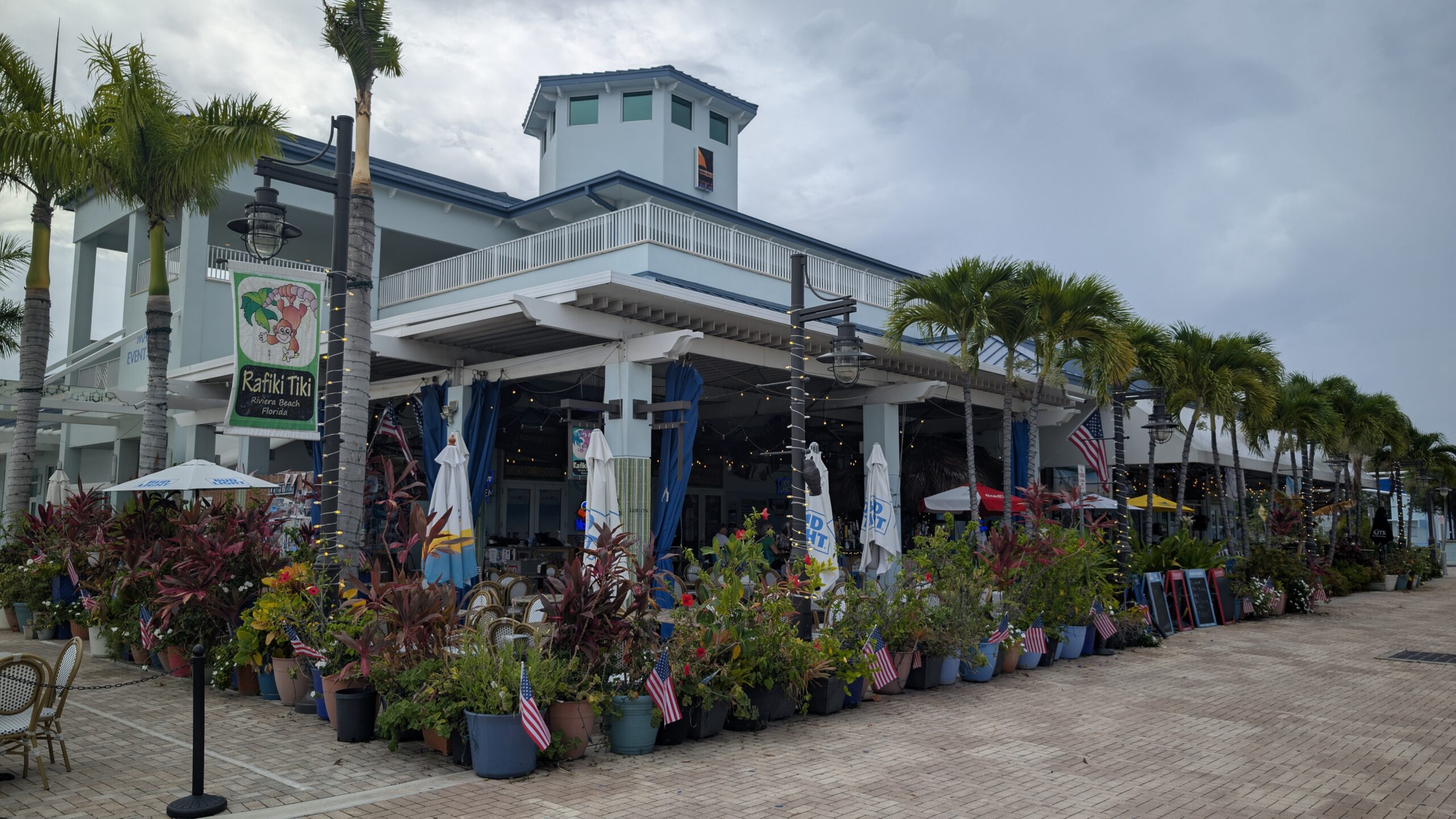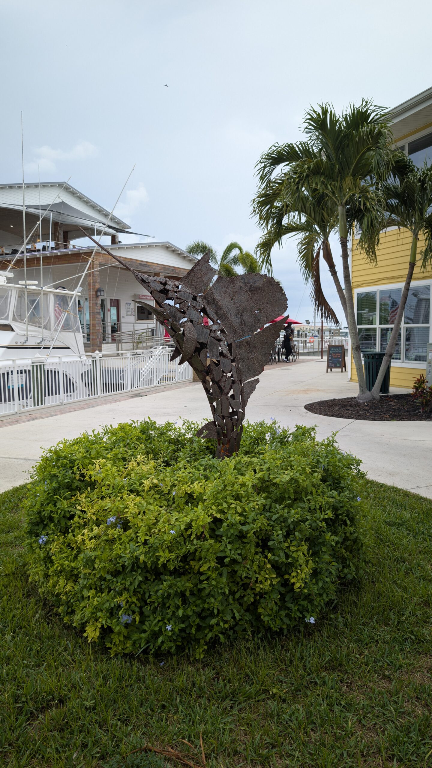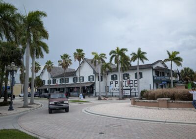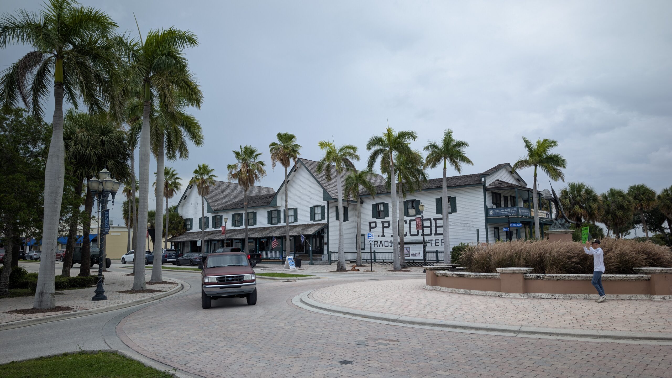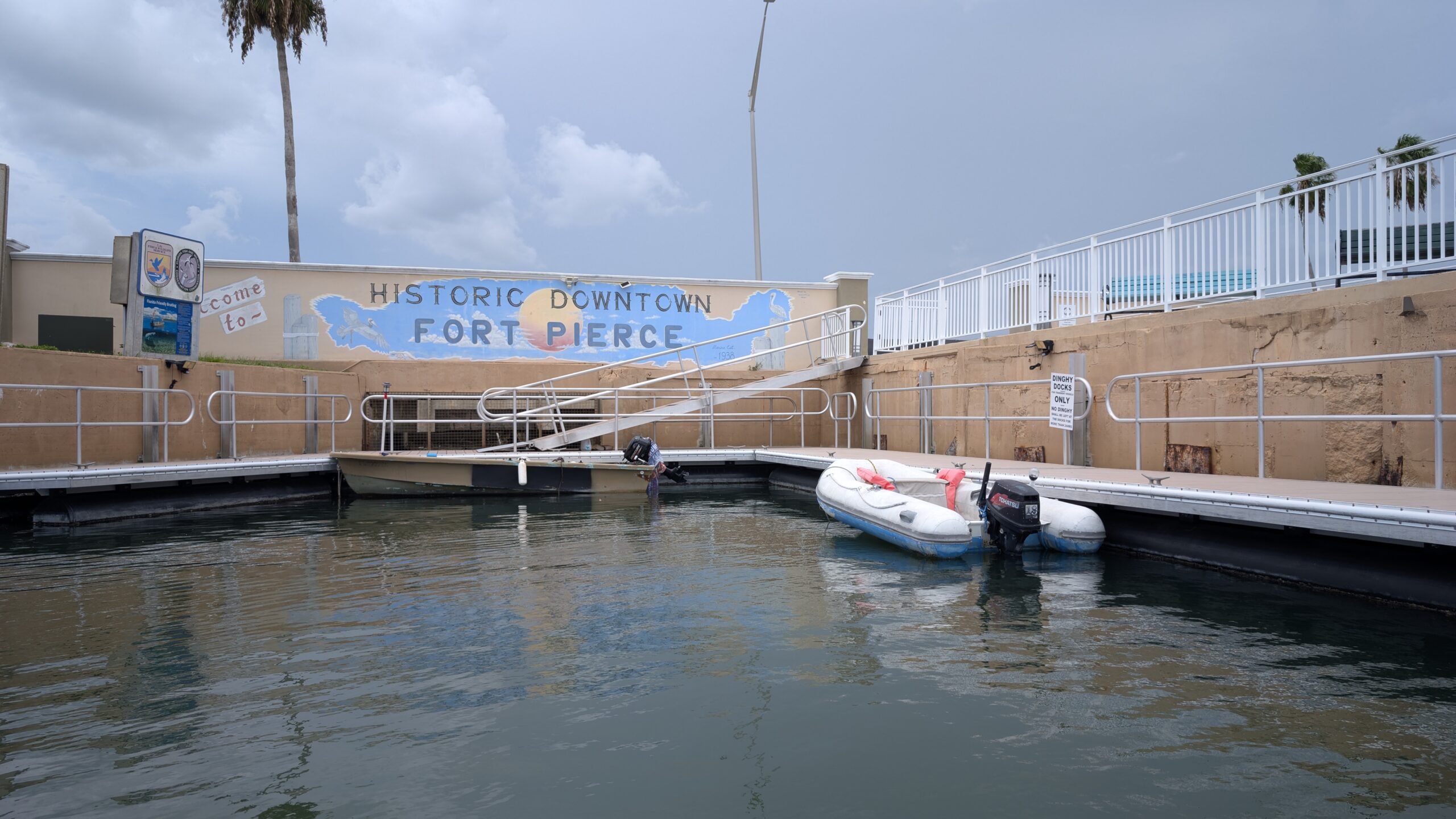 Aber wir kommen heil und sogar trocken wieder auf TomCAT an. Nun backe ich noch die Apfelstrudel fertig. Dann gehen wir auf eine Dinghy-Rundfahrt in der Gegend. Es ist sehr weitläufig und es künden sich bereits wieder Regenwolken an. Darum fahren wir nicht sehr weit und parken das Dinghy am sehr praktischen Dinghy Dock der Fort Pierce City Marina. Von hier spazieren wir durch das historische Viertel. Ist nicht viel los, da heute Feiertag ist. Sehr historisch wirkt es auch nicht. 😇