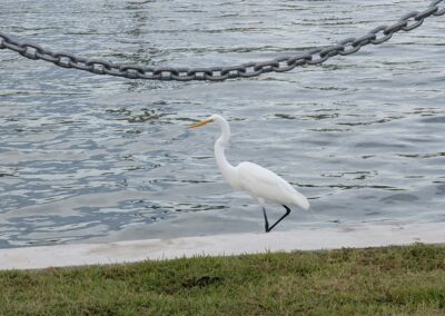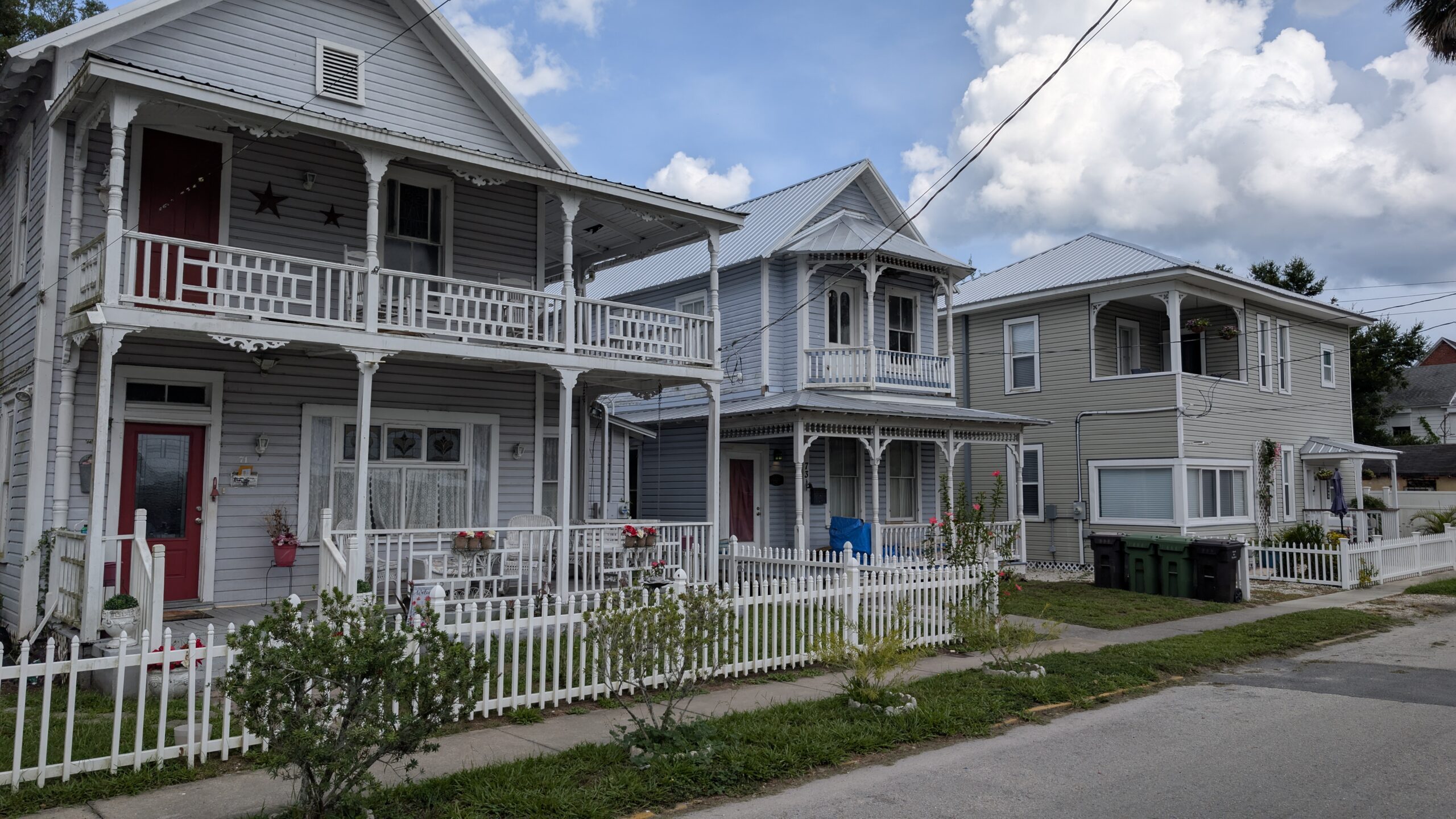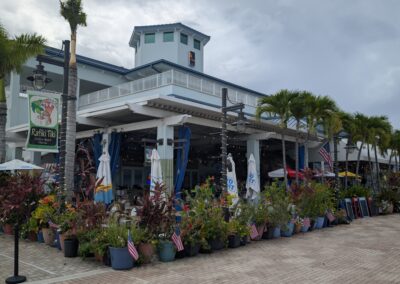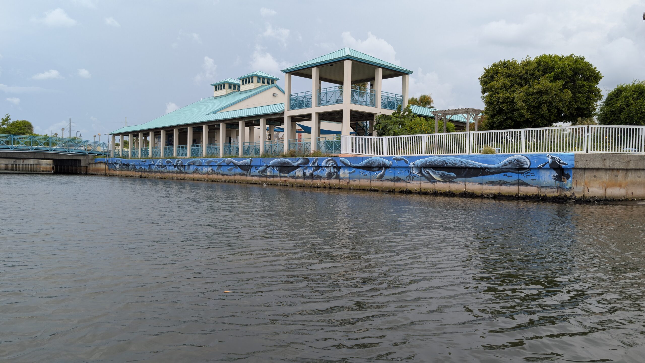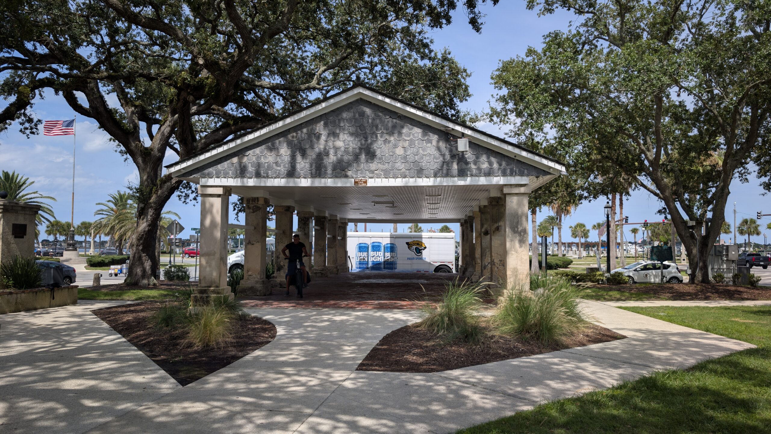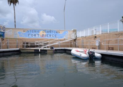 Aber wir kommen heil und sogar trocken wieder auf TomCAT an. Nun backe ich noch die Apfelstrudel fertig. Dann gehen wir auf eine Dinghy-Rundfahrt in der Gegend. Es ist sehr weitläufig und es künden sich bereits wieder Regenwolken an. Darum fahren wir nicht sehr weit und parken das Dinghy am sehr praktischen Dinghy Dock der Fort Pierce City Marina. Von hier spazieren wir durch das historische Viertel. Ist nicht viel los, da heute Feiertag ist. Sehr historisch wirkt es auch nicht. 😇