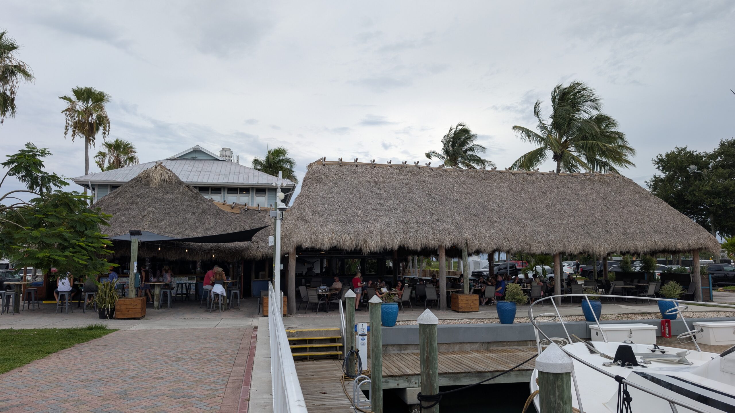 Der Regen und Sturm bleibt bis jetzt aus. Das Gewitter fühlt sich auch nicht mehr so nah an. Das nutzt Thomas und geht mit dem ausgefüllten Formular in’s Marina Office. Als er zurück ist, sitzen wir noch etwas rum und suchen ein Ort für’s Abendessen. Schliesslich wird’s das CQ’s Restaurant. Das einzige, das noch freie Tische hat. 😆