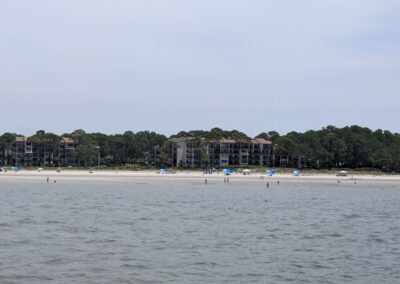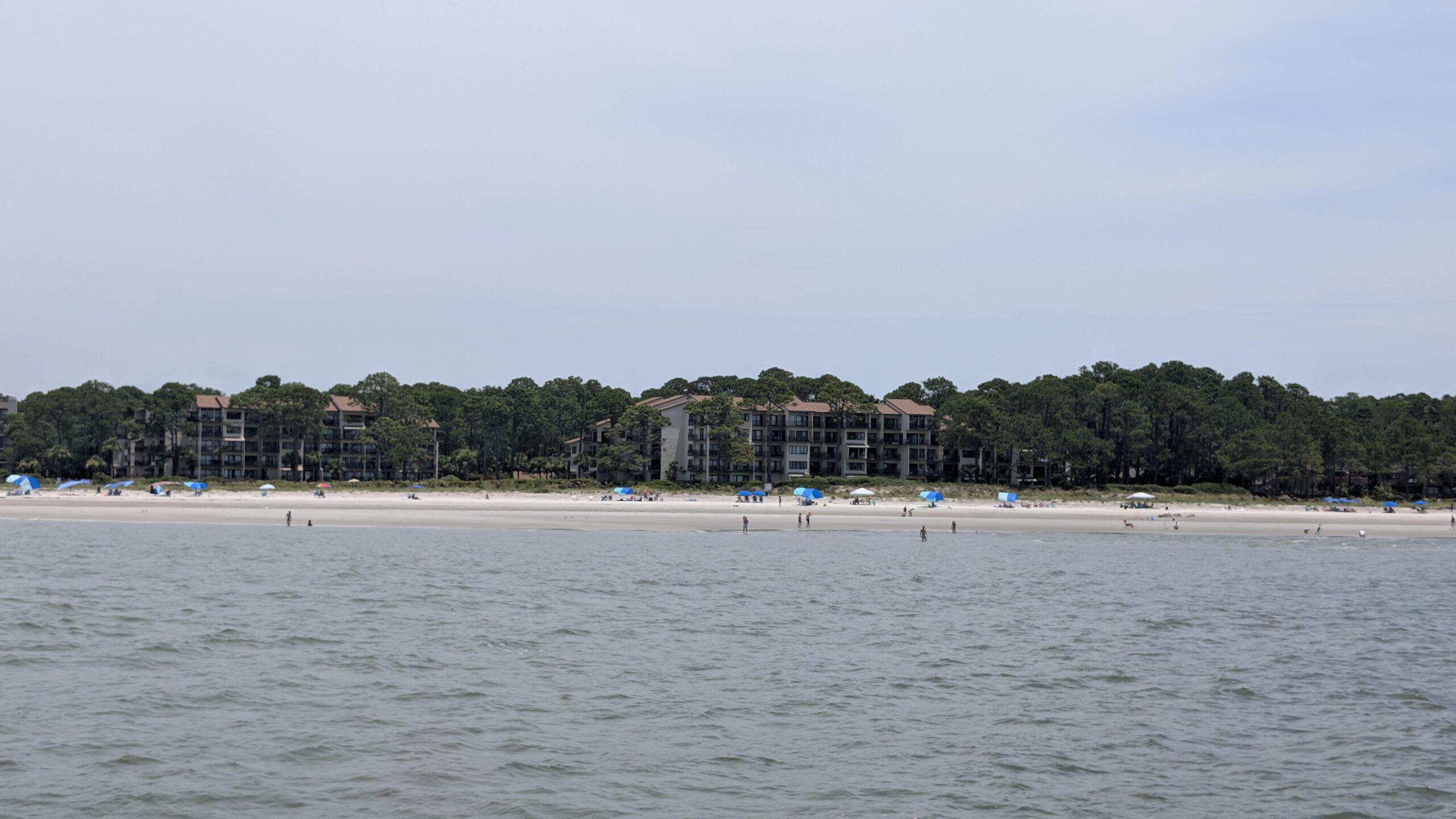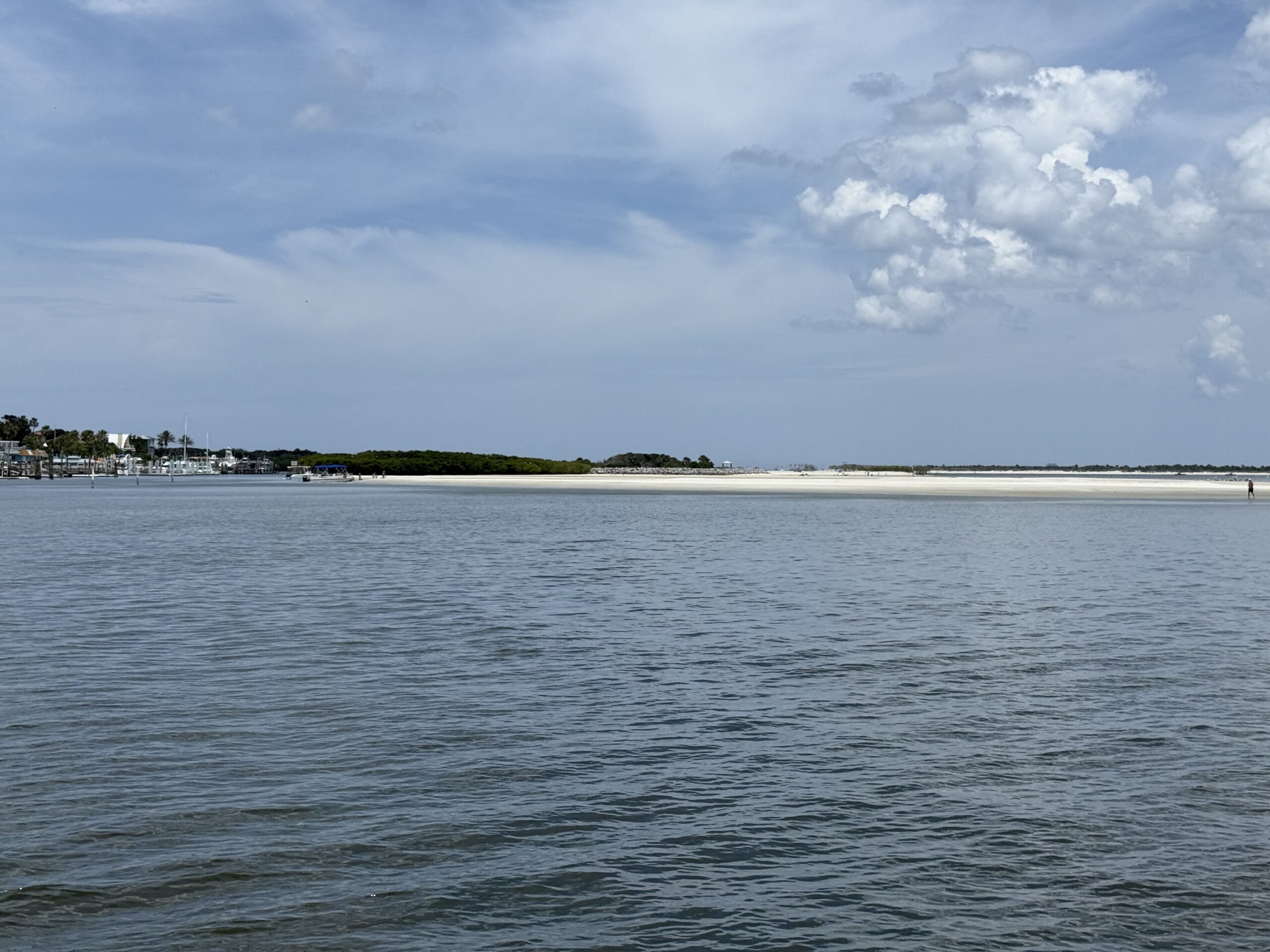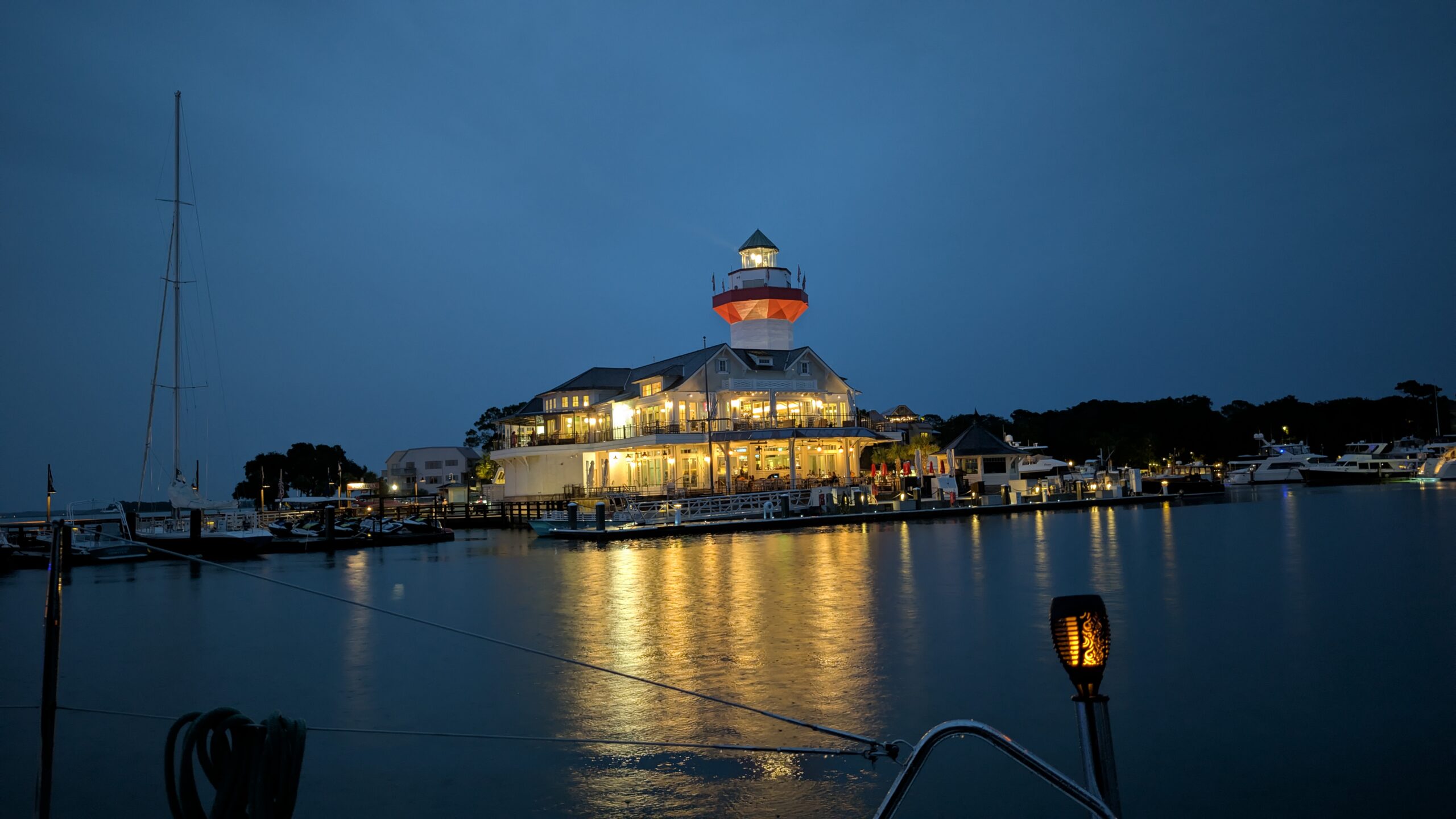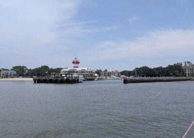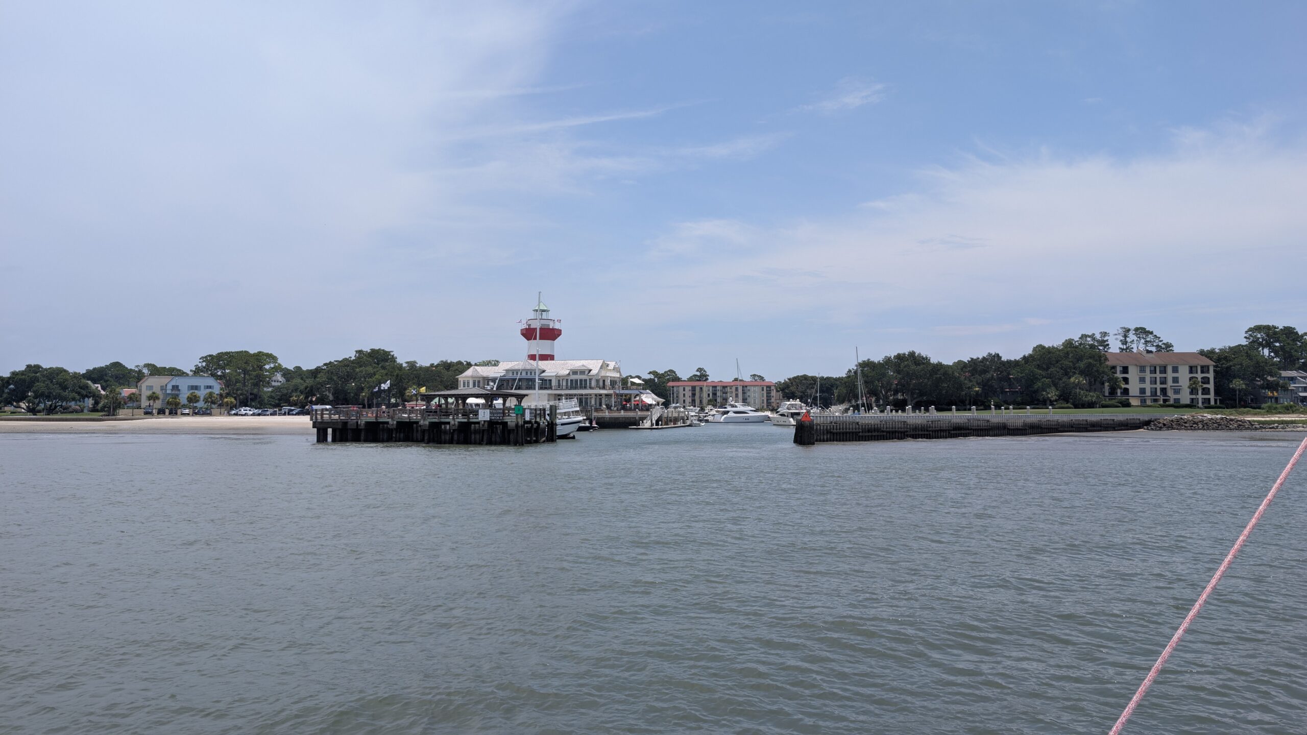 Mit etwas mehr Wellen, aber nicht viel mehr Wind motoren wir weiter nordwärts. Kurz vor 12 Uhr erreichen wir die Flussmündung des Savannah River. Dieser Fluss ist einerseits die Grenze zwischen den beiden Staaten Georgia und South Carolina und auch die Einfahrt zum Calibogue Sound, wo unsere Marina dran liegt. Wir müssen gegen eine Strömung von 1,5 – 3 Knoten kämpfen. Knappe 2 Stunden später erreichen wir dann endlich die Hafeneinfahrt der Harbour Town Marina. Hier tanken wir wieder voll. Dies ist die erste Tankstelle, an der wir problemlos tanken können, ohne Angst zu haben, dass der Diesel raussprudelt. 😁