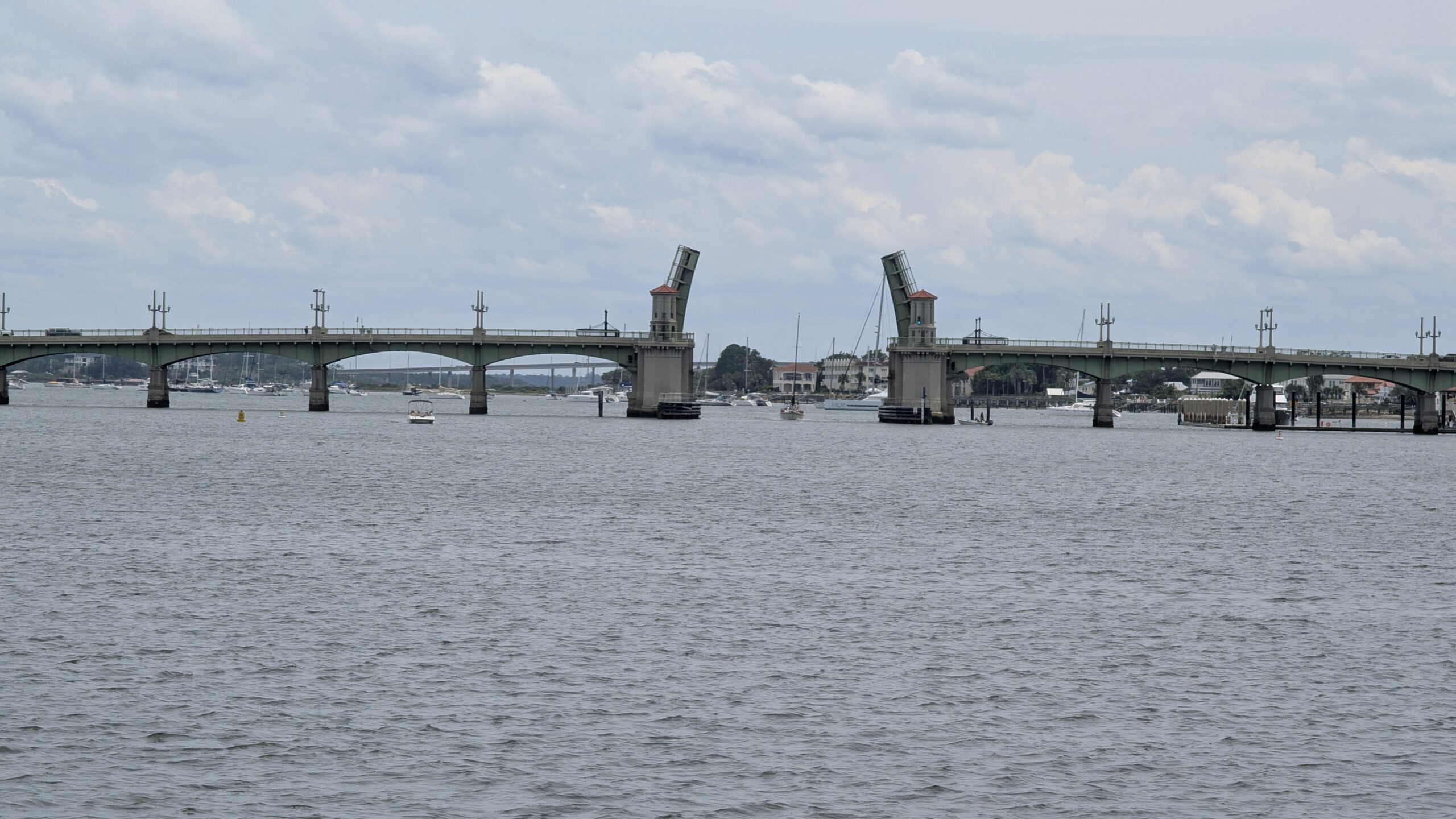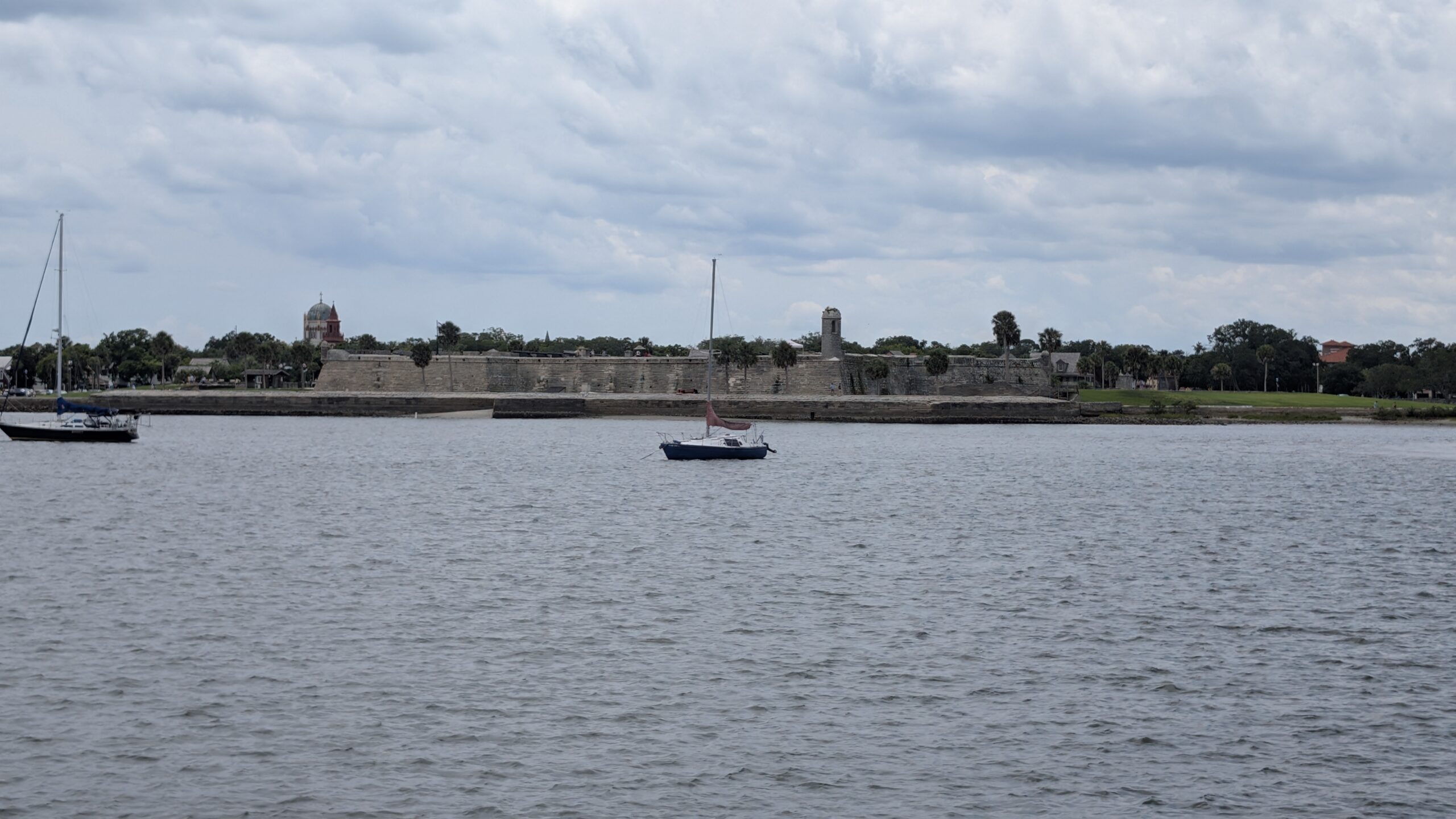 Kurz nach 14 Uhr erreichen wir den Eingang zum St. Augustine Inlet. 30 Minuten später ist der Anker gefallen. Das Wetter ist zurzeit nicht allzu schlecht. Wir nehmen schnell eine kühlende Dusche und gehen dann mit dem Dinghy auf Landausflug. In der St. Augustine Municipal Marina können wir es am Dinghy Dock parkieren. Es kostet zwar 15 USD, aber dafür dürfen wir dort Abfall entsorgen und sogar gratis duschen. 😁