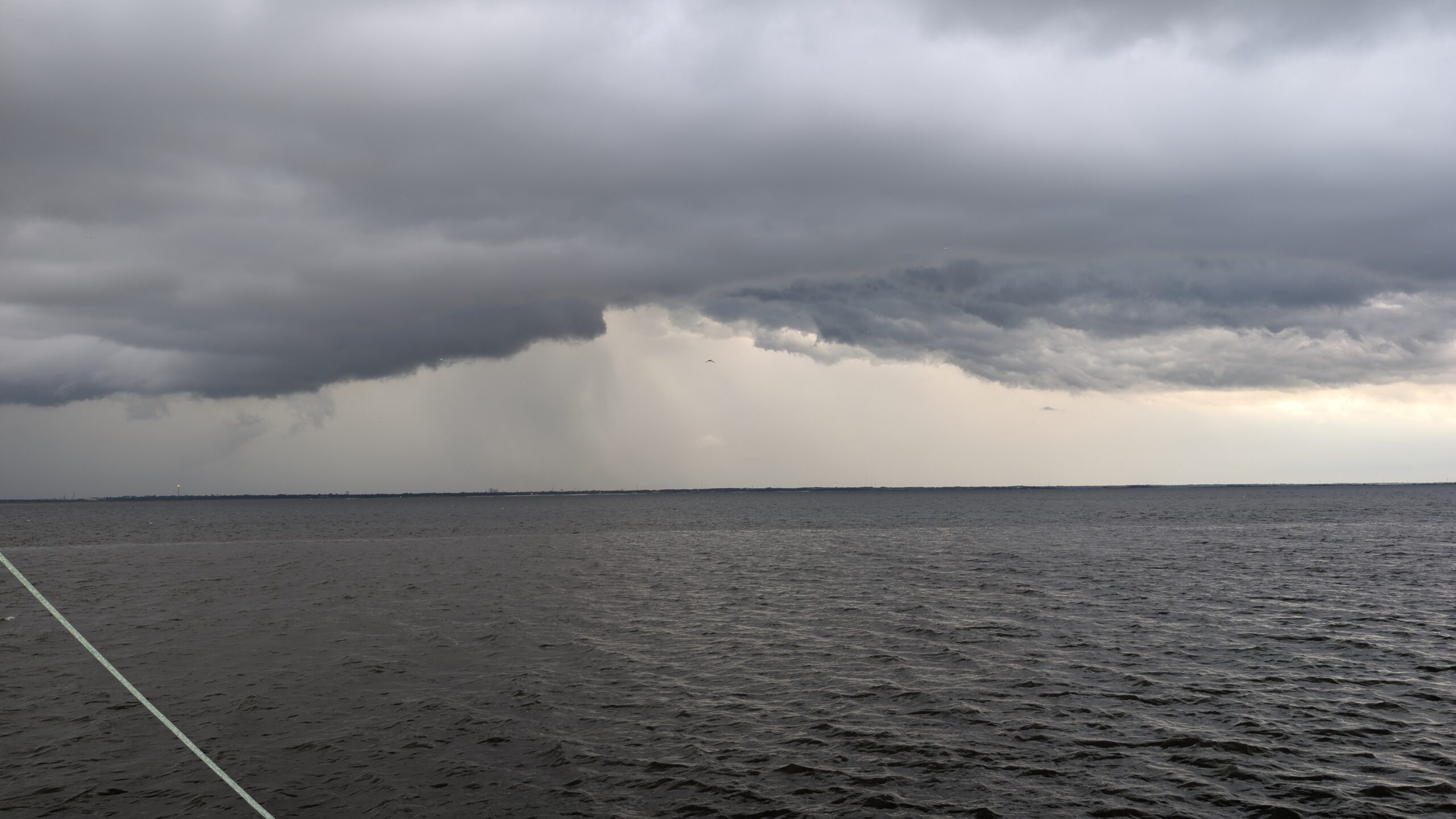 Da schlagen auch noch Blitze nur 600 Meter von uns entfernt ein. Da wo wir grad sind, eigentlich in einer Fahrrinne, lassen wir den Anker runter und lassen das Ganze über uns ergehen. 😑