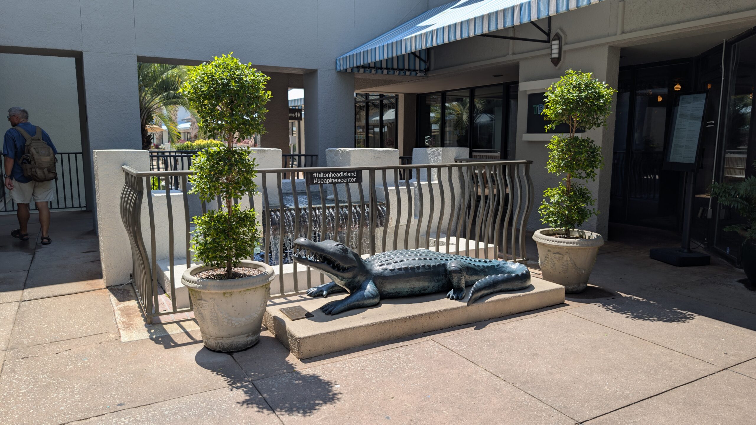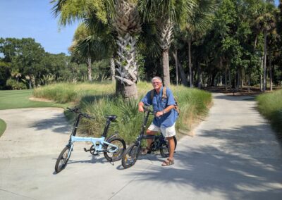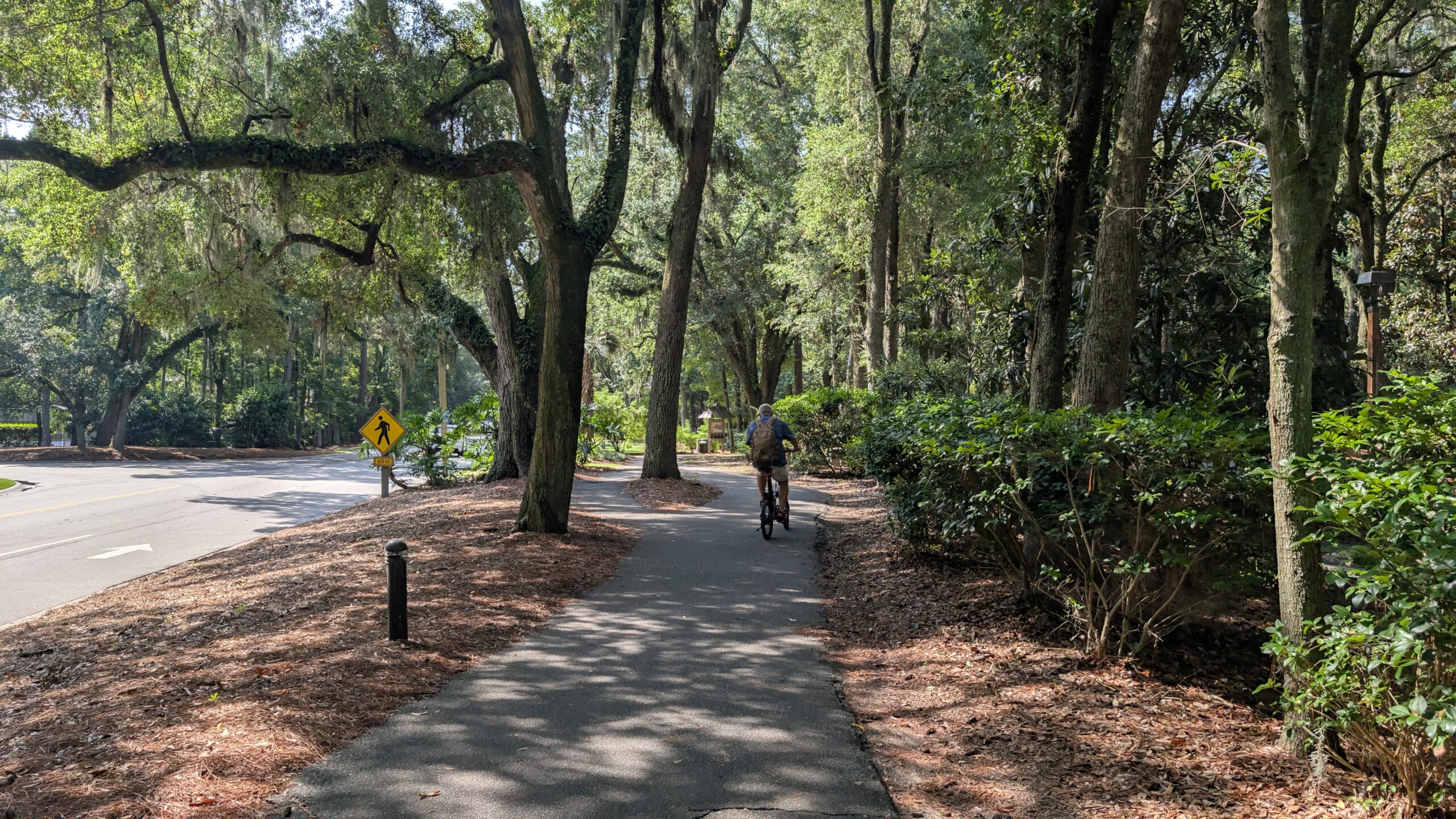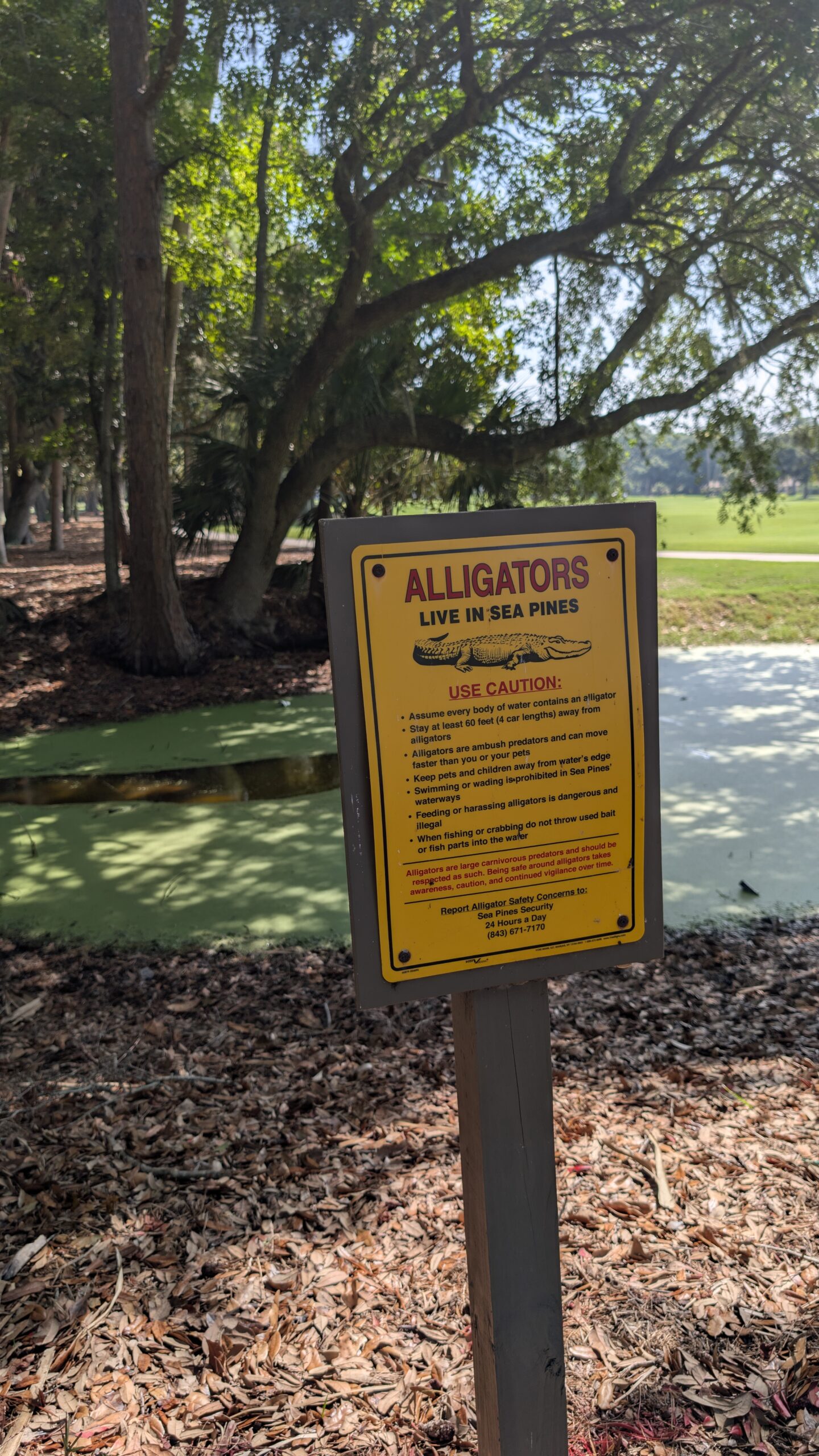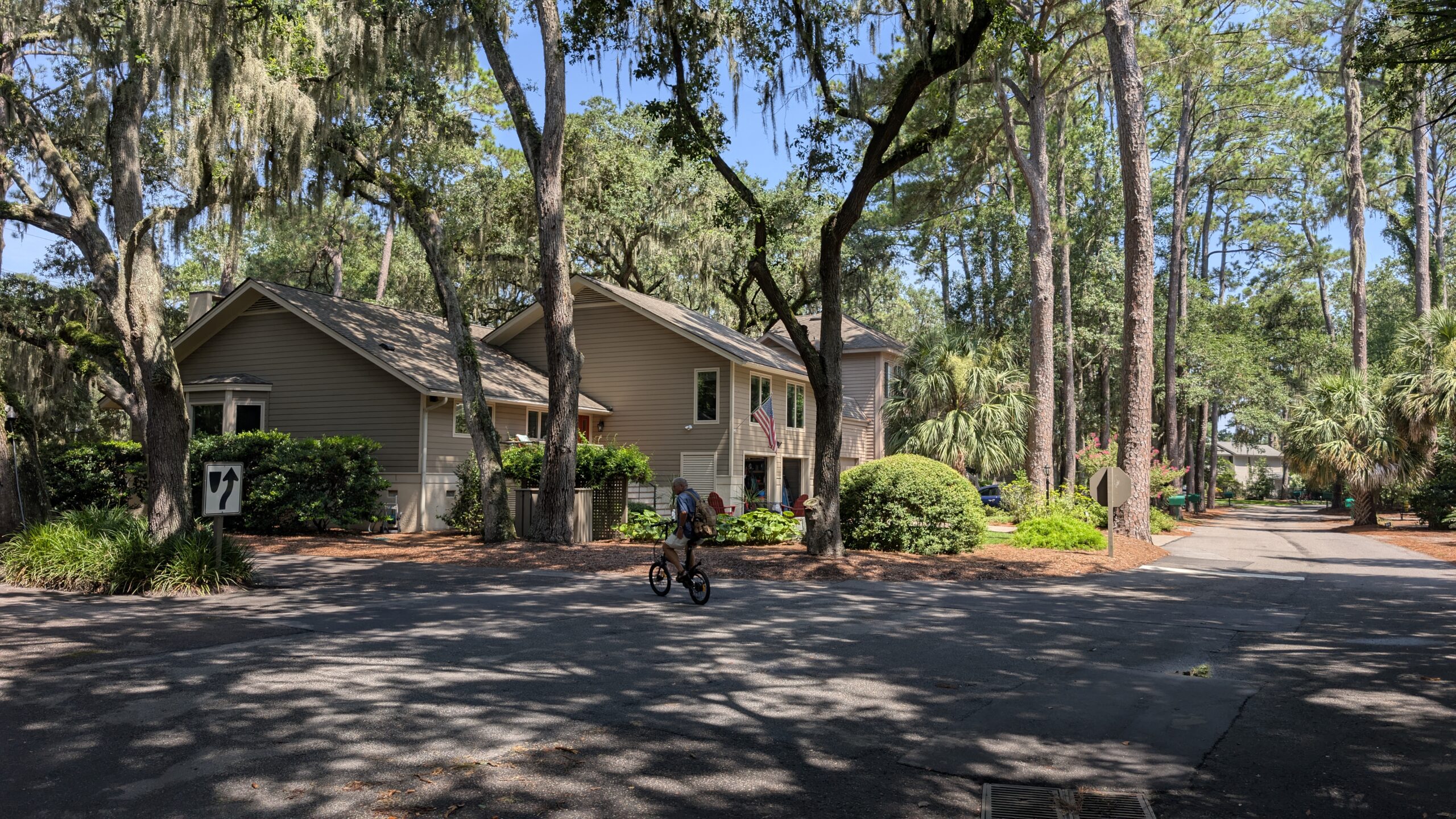 Heute morgen hält Thomas erst mal eine TelKo ab. Anschliessend packen wir unsere Fahrräder und Zubehör aus. Wir starten auf eine Rundfahrt durch einen Teil von Hilton Head Island. Die ganze Insel ist ja riesig. Wir bleiben aber praktisch immer innerhalb der Sea Pines Community. Es ist wunderschön, alles ist unter riesigen Bäumen. Und man hat das Gefühl, man ist in einem Zoo. Es hat viele Vögel, Eichhörnchen, Pferde, Gürteltiere und sogar einen Alligator entdecken wir. 😊