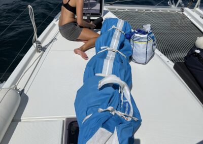 Bis 16 Uhr haben wir schönstes, heisses Wetter. Wir können sogar unterwegs den Code-0, alle Leinen und Fender versorgen. Dann nähert sich ein Gewitter. Es bringt aber nur wenig Regen und dann löst es sich auf.