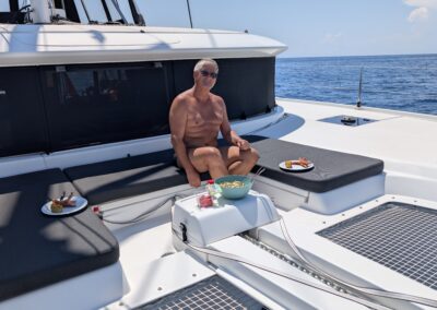 Wir geniessen unseren Linner heute auf dem Vordeck während Fahrt 😁