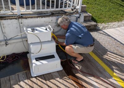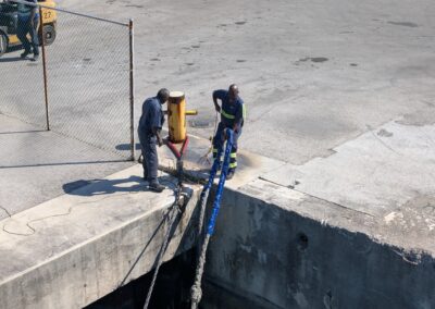 Am Nachmittag probiert Thomas mithilfe eines Tauchers und der Einzugsaite den Abwasser-Schlauch (der Schwarzwassertank auf der Backbordseite lässt sich nicht mehr leeren) zu entstopfen. Leider ohne Erfolg.