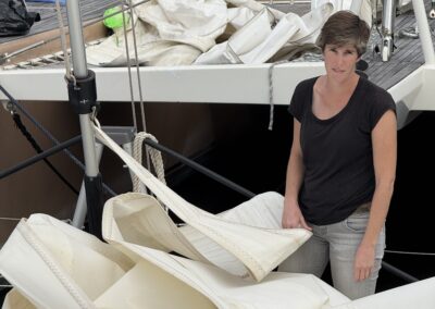 Danach nutzen wir das laue Wetter aus und nehmen das Vorsegel runter. Das ist ja ganz einfach. Was allerdings dann nicht so einfach ist, ist das Segel so zusammenzulegen, dass es in den Segelsack passt. 😆