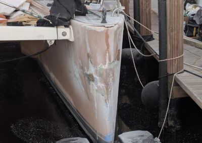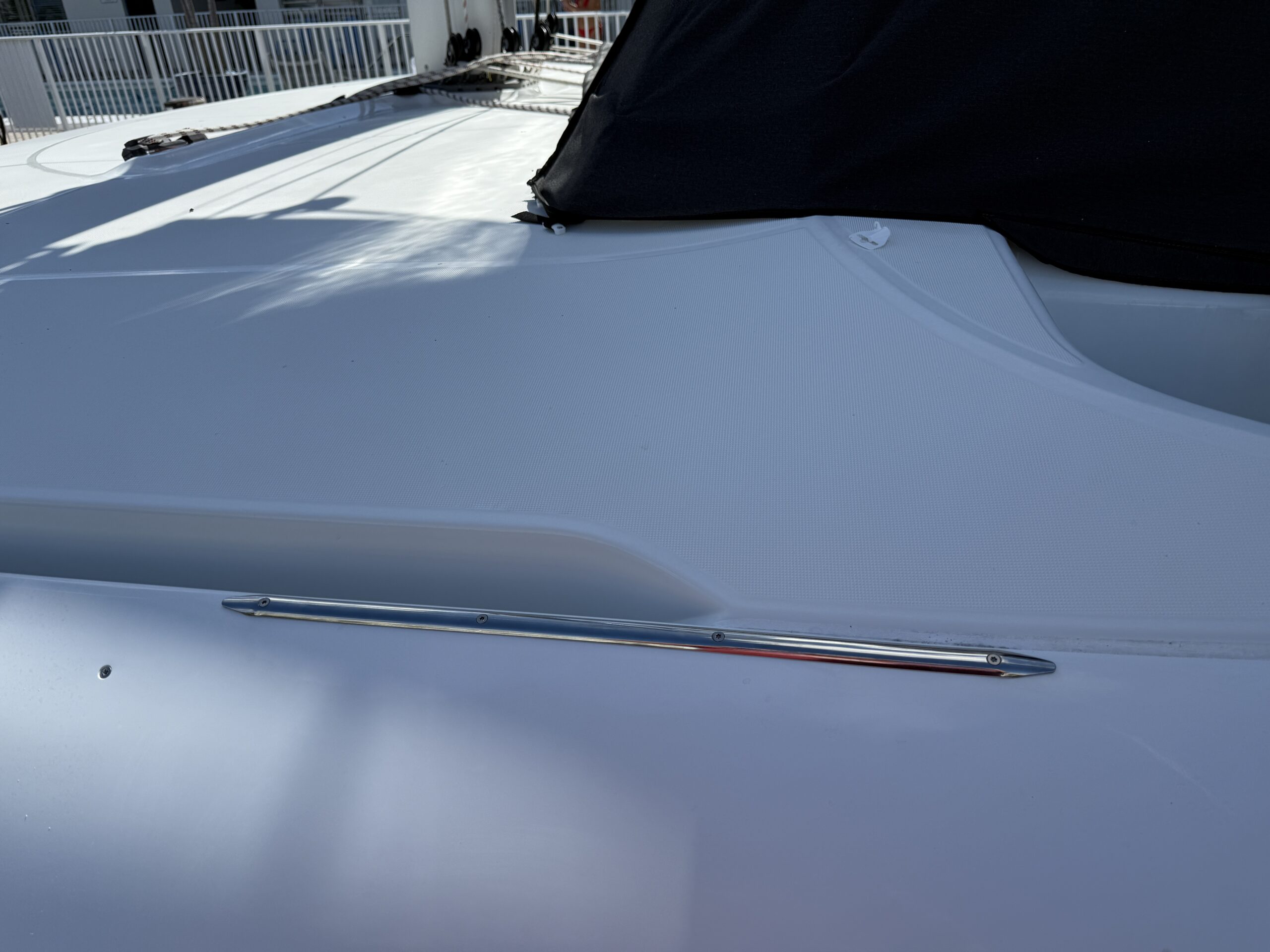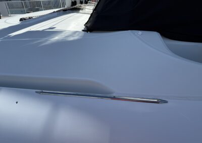 Unterdessen will ich die Scheuerleiste (für Bullenstander und Barberholer) auf der Backbordseite verschieben, da sie am falschen Ort. Aber das ist einfacher gesagt als getan. Die Leiste ist mit Sika-Flex angeklebt und lässt sich nur schwer entfernen. Dazu kommt, dass der Gelcoat darunter ganz gelb ist. Das heisst also, wir müssen erst mal Politur oder eine längere Leiste kaufen.