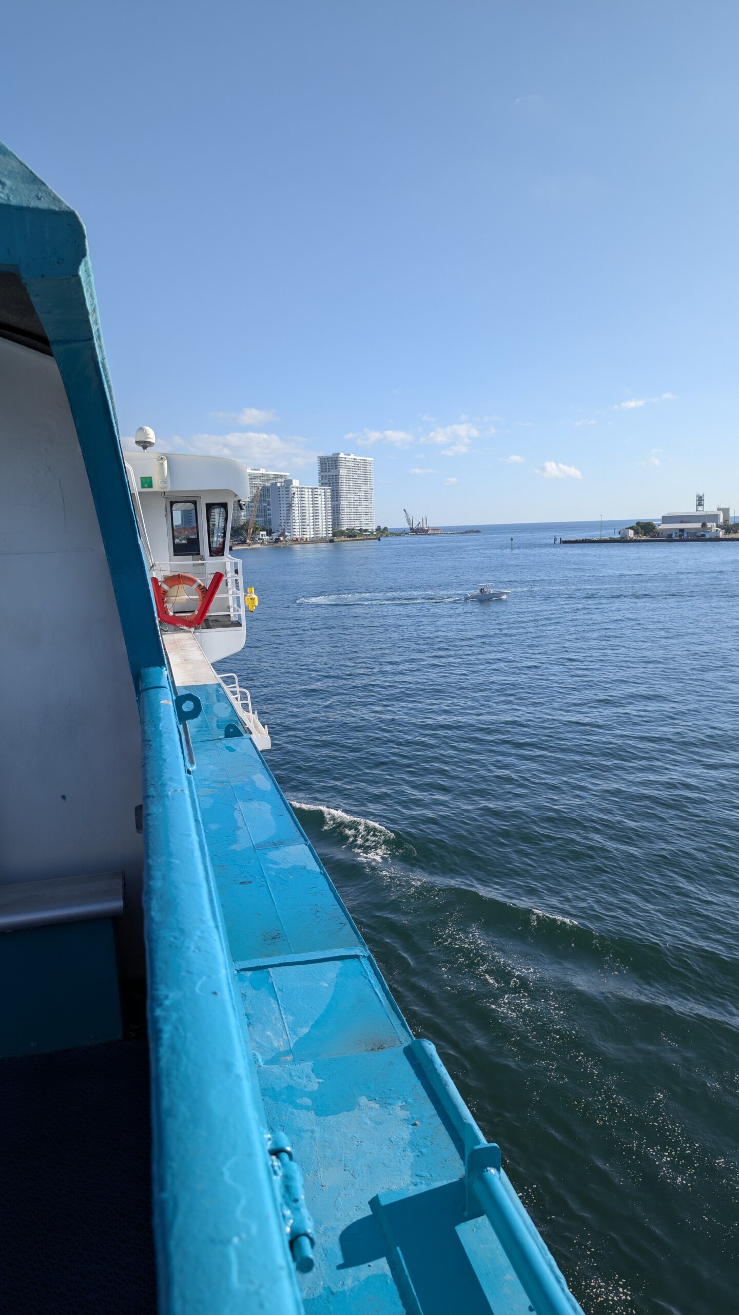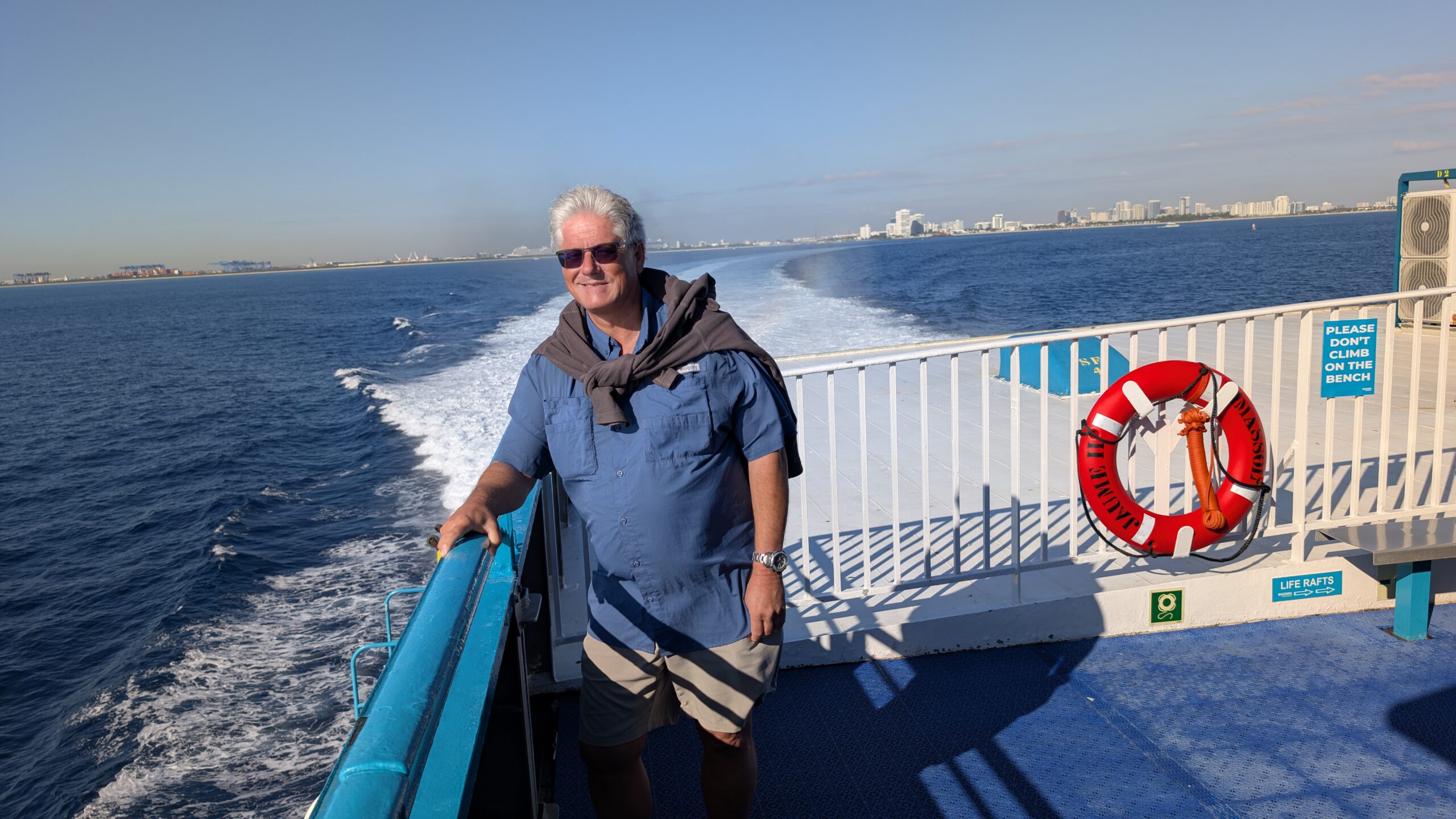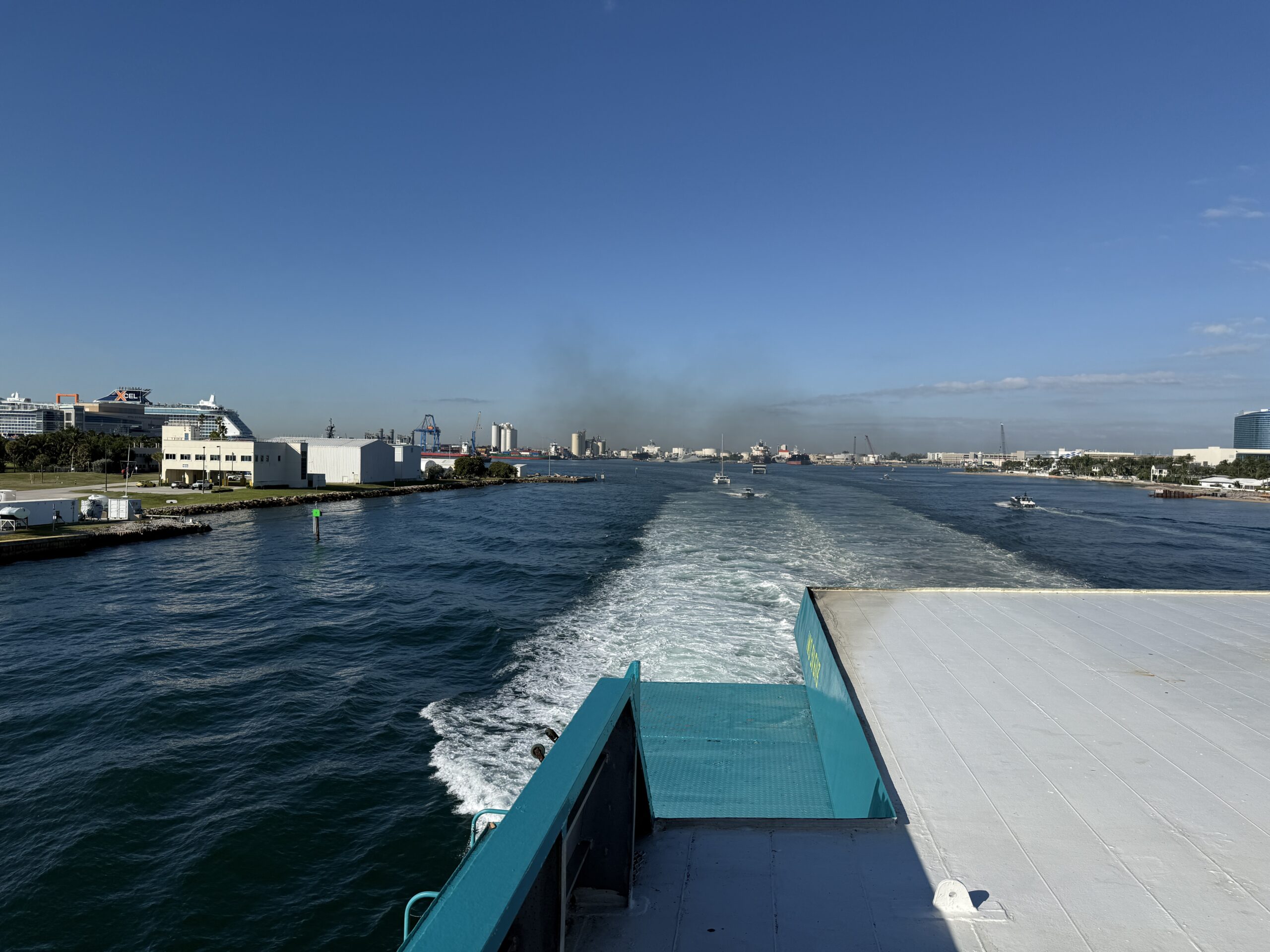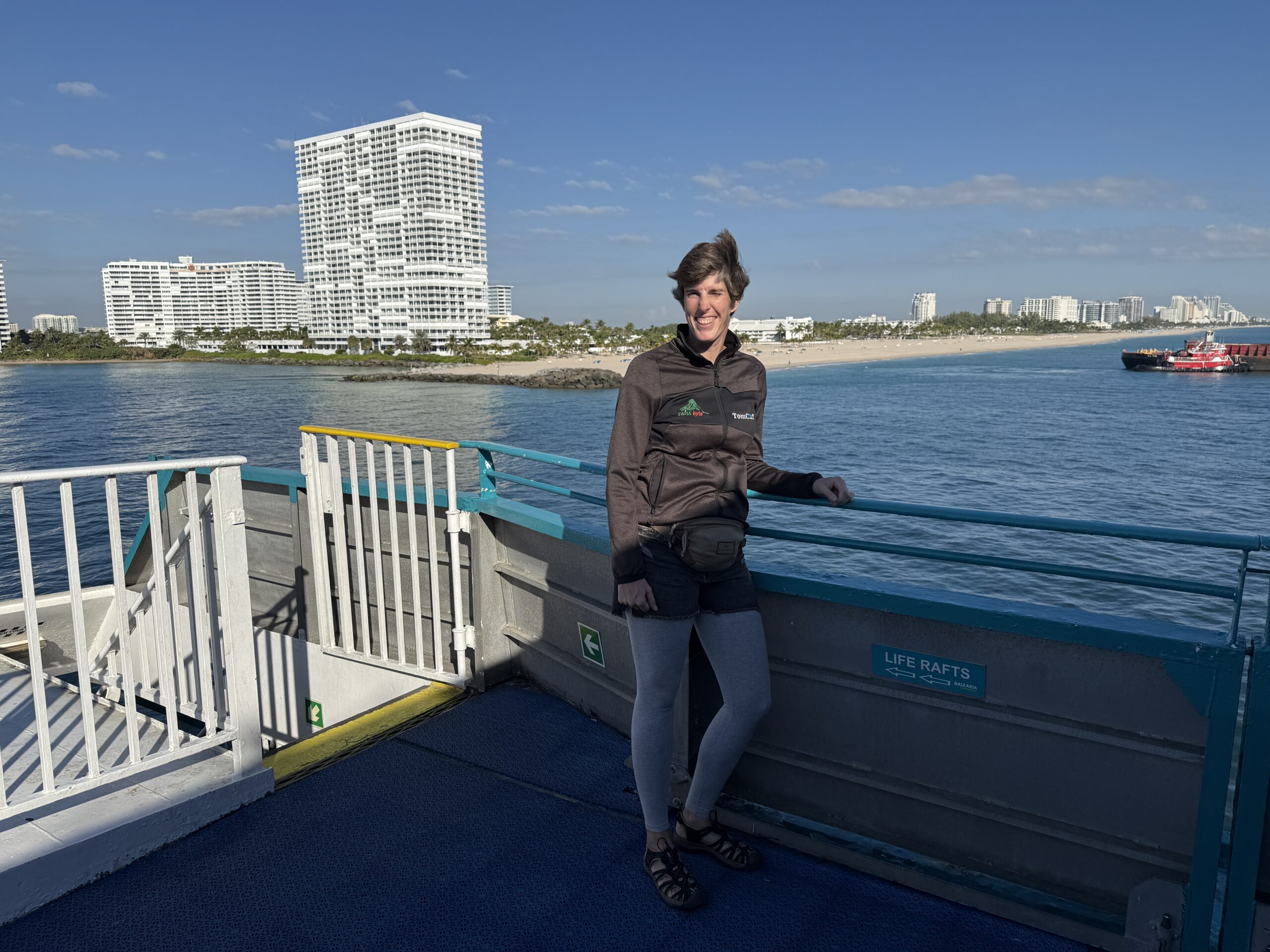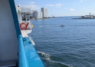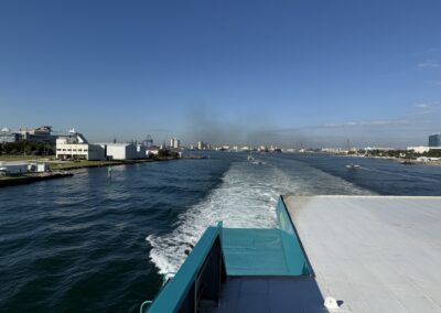Denn heute klingelt um 6 Uhr der Wecker. Und um 6:40 Uhr lädt uns der Uber-Fahrer beim Fähr-Terminal im Port Everglades aus. Es hat sehr wenige Passagiere und der Check-In ist eine kurze Sache. Nach 1,5 Stunden warten, können wir die Fähre boarden. Pünktlich um 9 Uhr legt die Fähre ab und wir fahren mit 30 Knoten in Richtung Grand Bahama.