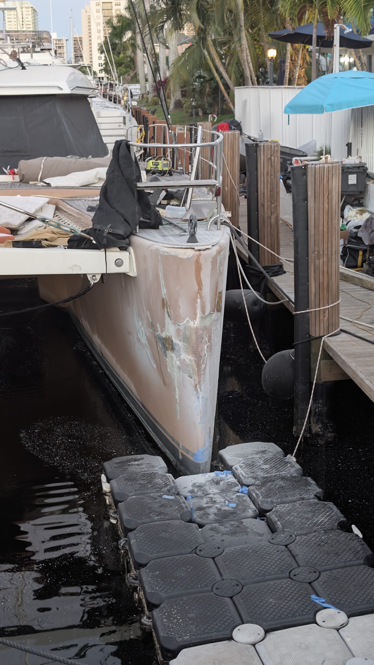 Das Wasser oder der Steg, oder irgendwas hat komischen Schutz auf unsere Fender geschmiert. Und der Fender nun an den Rumpf. Das versuche ich nun zu entfernen. Das ist leider nicht so einfach wie gedacht. Auf dem Schiffsrumpf lässt sich der Schmutz immerhin einigermassen gut wegputzen, was man vom Fender jedoch nicht behaupten kann. 😑