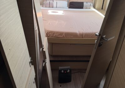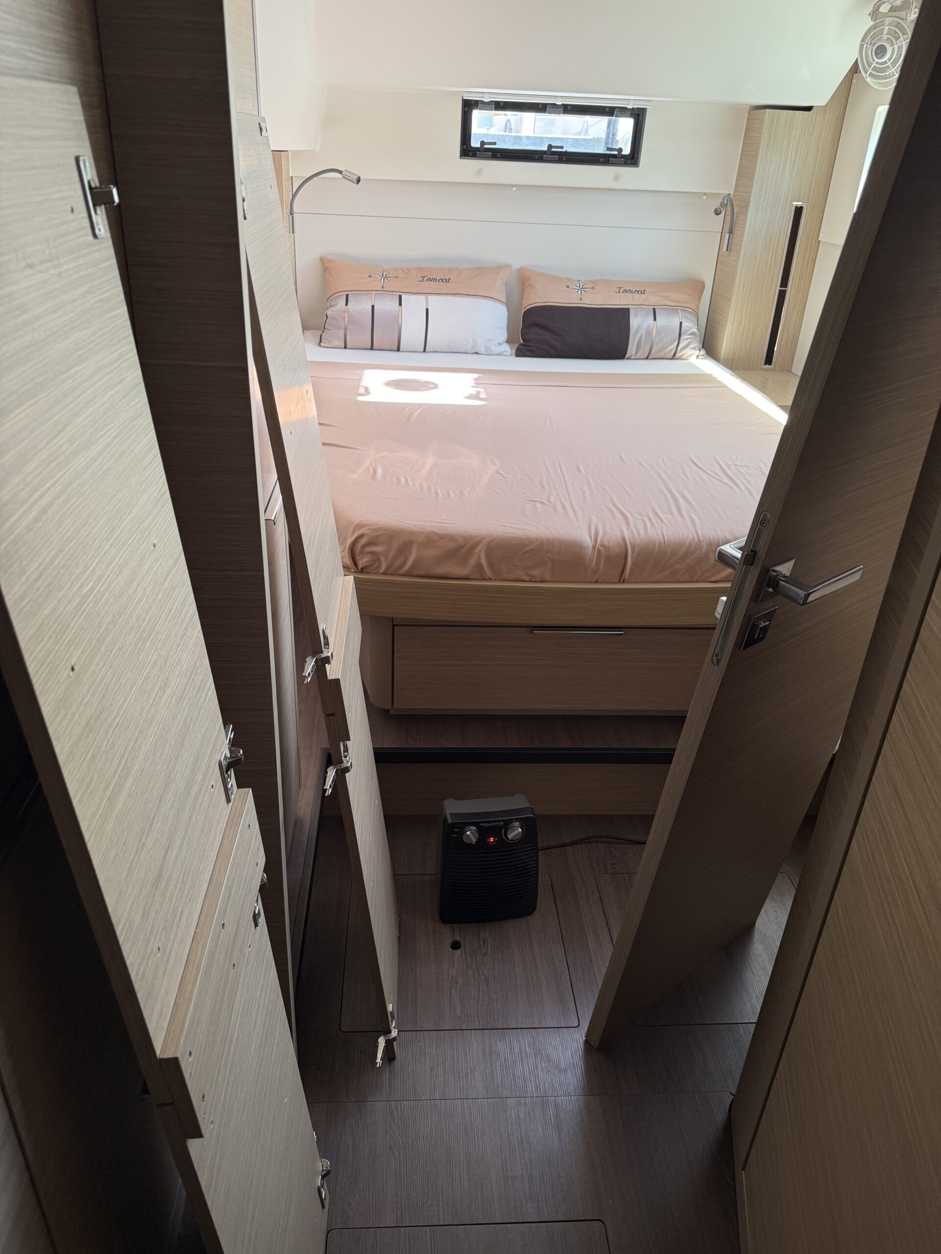 Als es dann dunkel ist und alle Mücken weg sind, versorgen wir die Elektro-Trottis in der Bugkabine und takeln den Code-0 auf.
