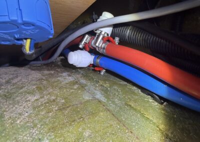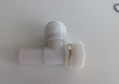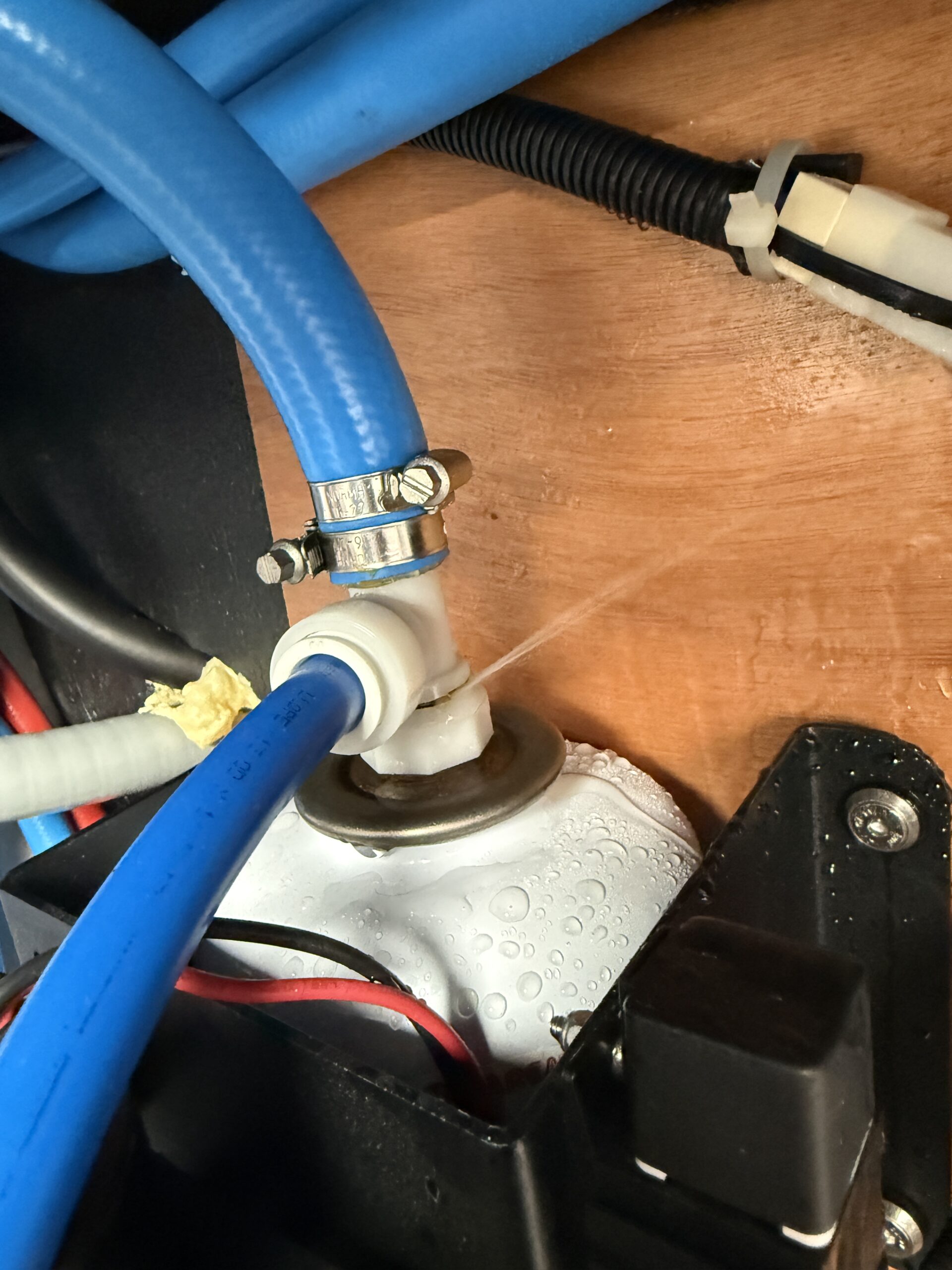 Schnell wird die Wasserpumpe ausgeschaltet und die Waschmaschine wieder in Position gebracht, dann müssen wir im Motorraum nachschauen wo dort das Leck ist. Tja… dort ist das Verbindungsstück von Pumpe zum Druckspeicher gebrochen bzw. ist dabei ganz zu brechen. 😑