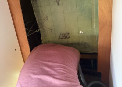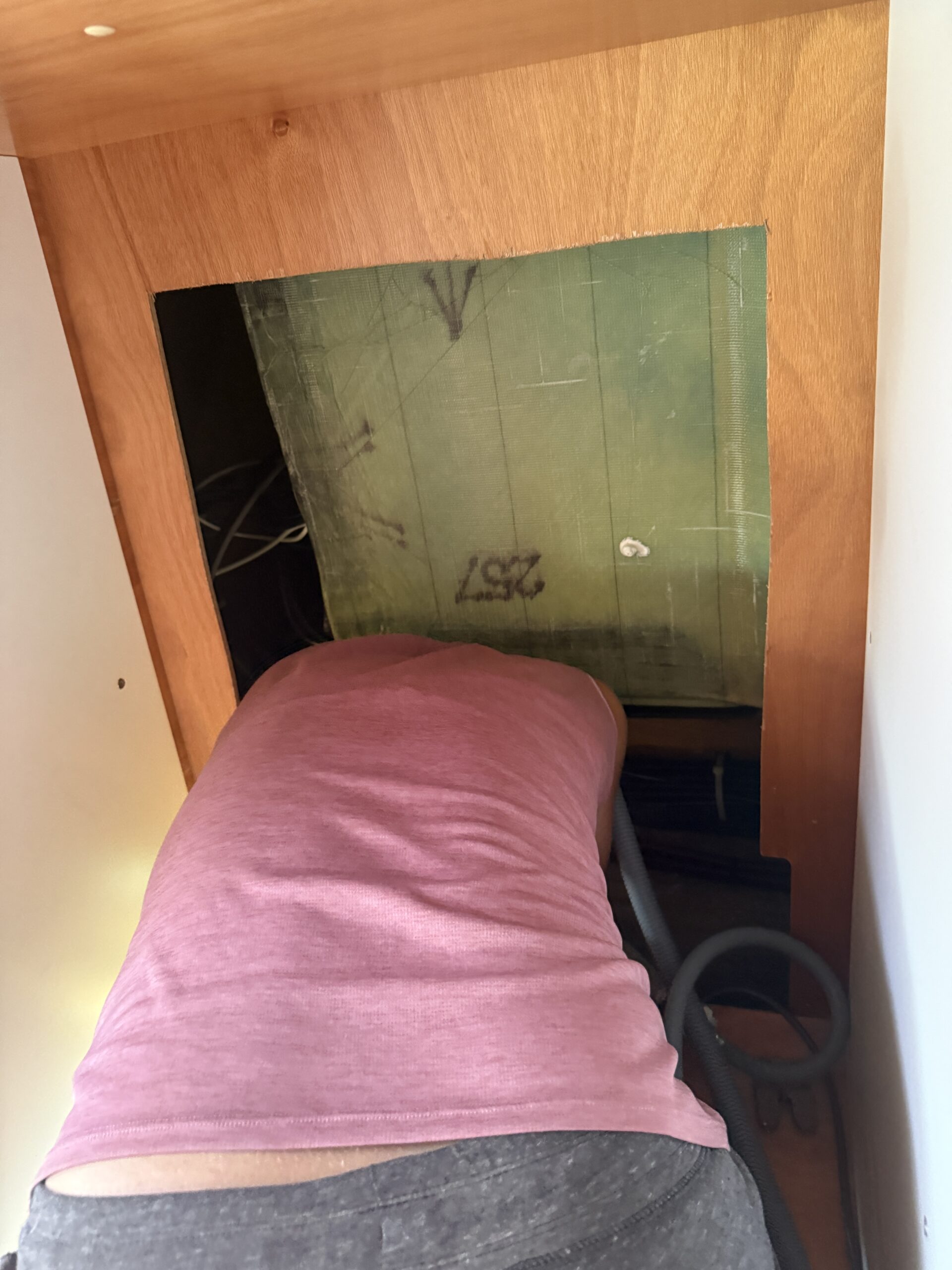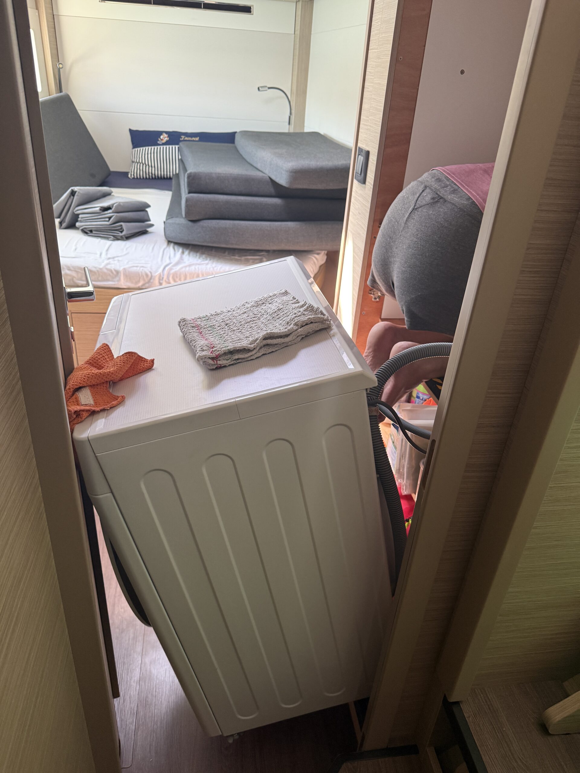 Heute Morgen stellen wir als erstes die Pläne und Dokumentationen für die Architektin fertig und schicken es ihr. Danach wollen wir uns mal um das Wasserleck kümmern. Schon lange ist es ja so, dass die Bilgenpumpe im Backbord-Rumpf immer wieder kurz läuft. Was heisst, dass von irgendwo her Wasser in die Bilge läuft. Und bei der Waschmaschine läuft ein Rinnsal Wasser in die Bilge. Vermutlich sind da die Briden locker oder es sind zu wenige angebracht. Um das nun zu beheben müssen wir die Waschmaschine ausbauen. Und um diese raus zu nehmen müssen erst alle Türen in dieser Kabine abmontiert werden. 😊