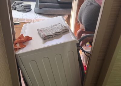 Als dann genug Platz ist, können wir die Waschmaschine gut ab den Absatz stellen und der Toiletten-Tür anlehnen. Und ich kann in den leeren Platz kriechen und die fehlenden Briden montieren und die bestehenden anziehen. Nun tropft es hier nicht mehr. 😊