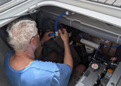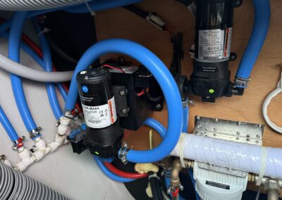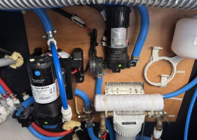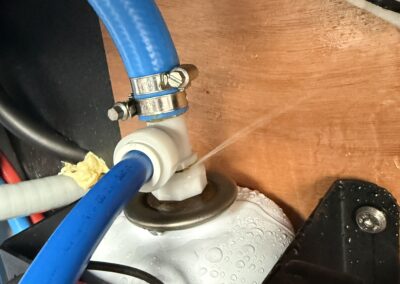 Allerdings hören wir nun beim Testen einen steten Wasserfluss und die Bilgenpumpe läuft öfters… das eigentliche Problem muss also wo anders sein. Wir öffnen die Bodenplatte uns sehen, dass das ganze Wasser aus dem Motorraum kommt. 😨