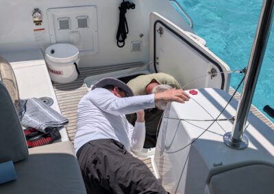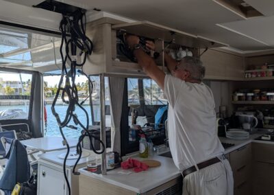 Gegen Mittag fahren wir zu Rudy auf die Crazy Idea. Er möchte unseren Rat bei seinem Tender-Lift, Ankerwinch und der Victron Quattro-Vernetzung.
