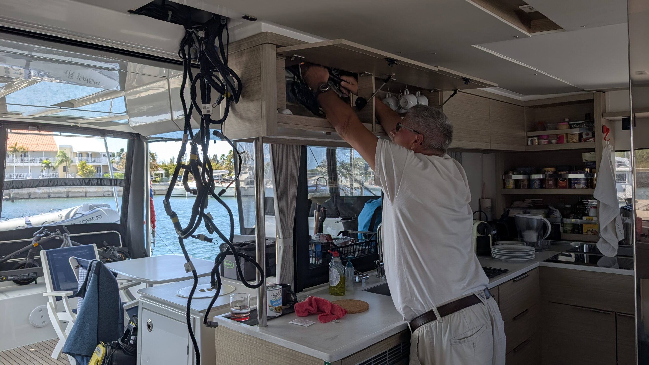 Nachdem er wieder gegangen ist, versuchen wir den Fehler bei der Motoren-Steuerung und Anker-Fernsteuerung zu finden. Dabei werden wir jedoch von Andi und Michaela unterbrochen. Die beiden sind aus Deutschland und mit ihrem Schiff wieder auf dem Rückweg nach Europa. Sie holen sich bei uns ein paar Tipps über Starlink und die Einreise in die USA ab.