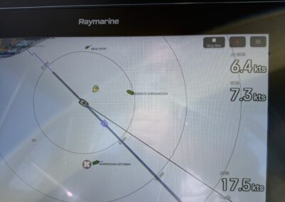 Der Wind allerdings weht stärker als erwartet und vor allem sehr böig. Wir sind mit durchschnittlich 6,6 Knoten und einer Spitze von 8,3 Knoten unterwegs.