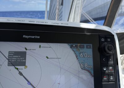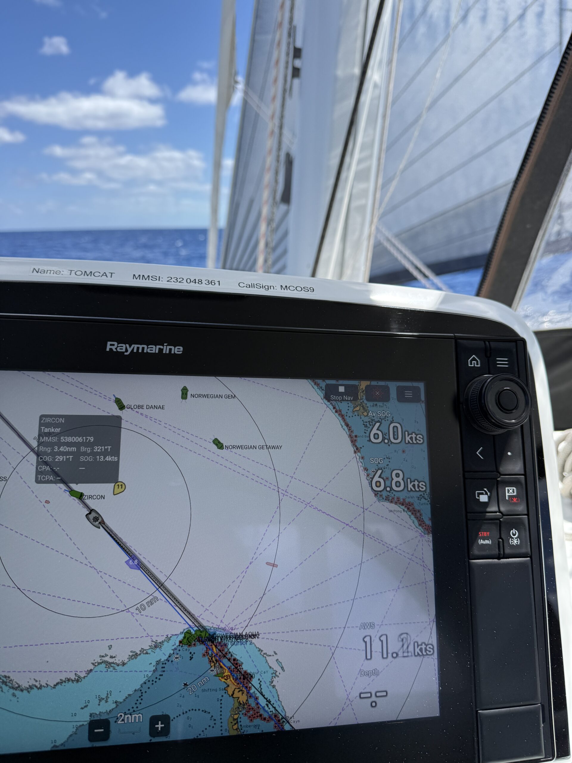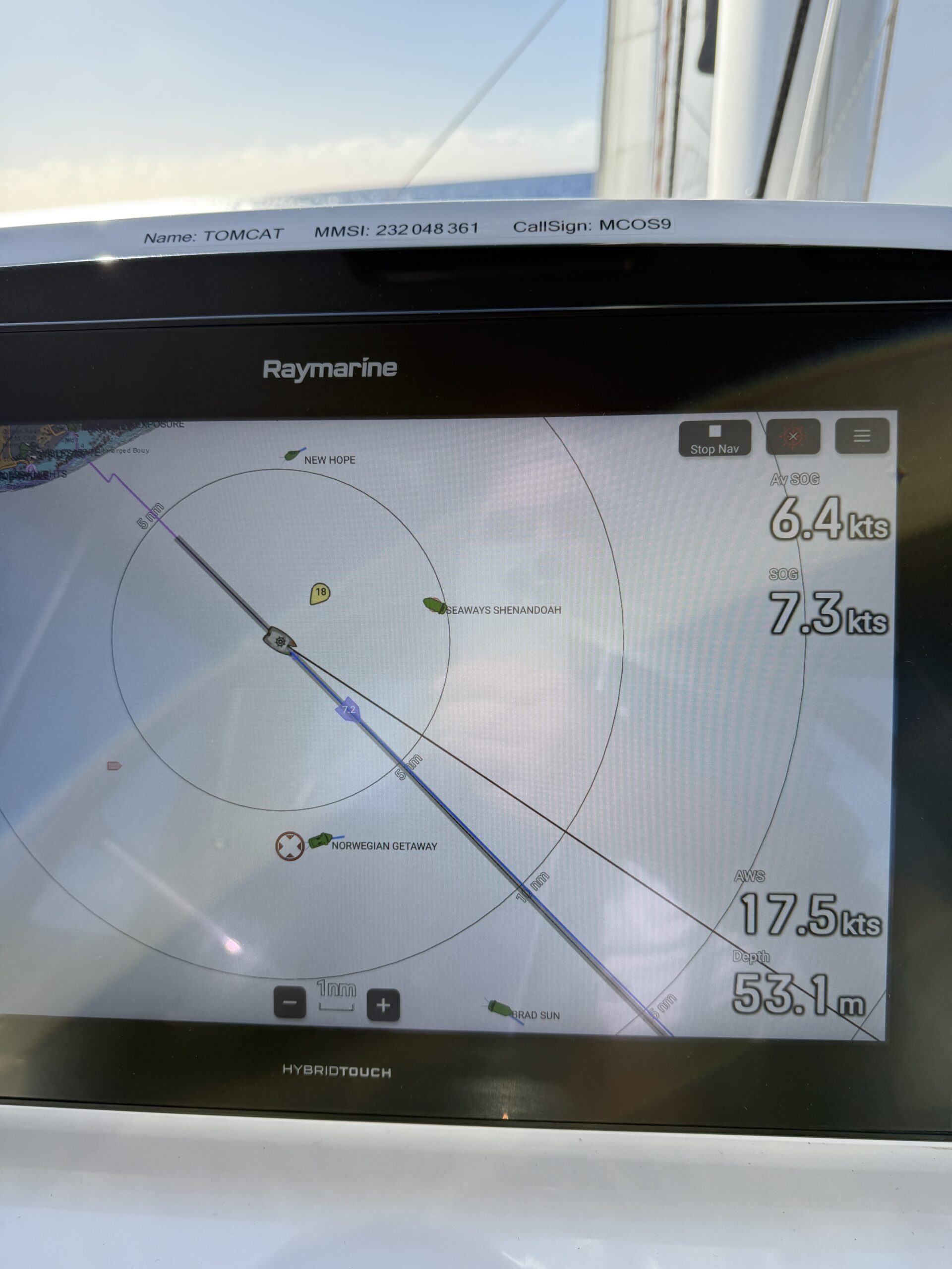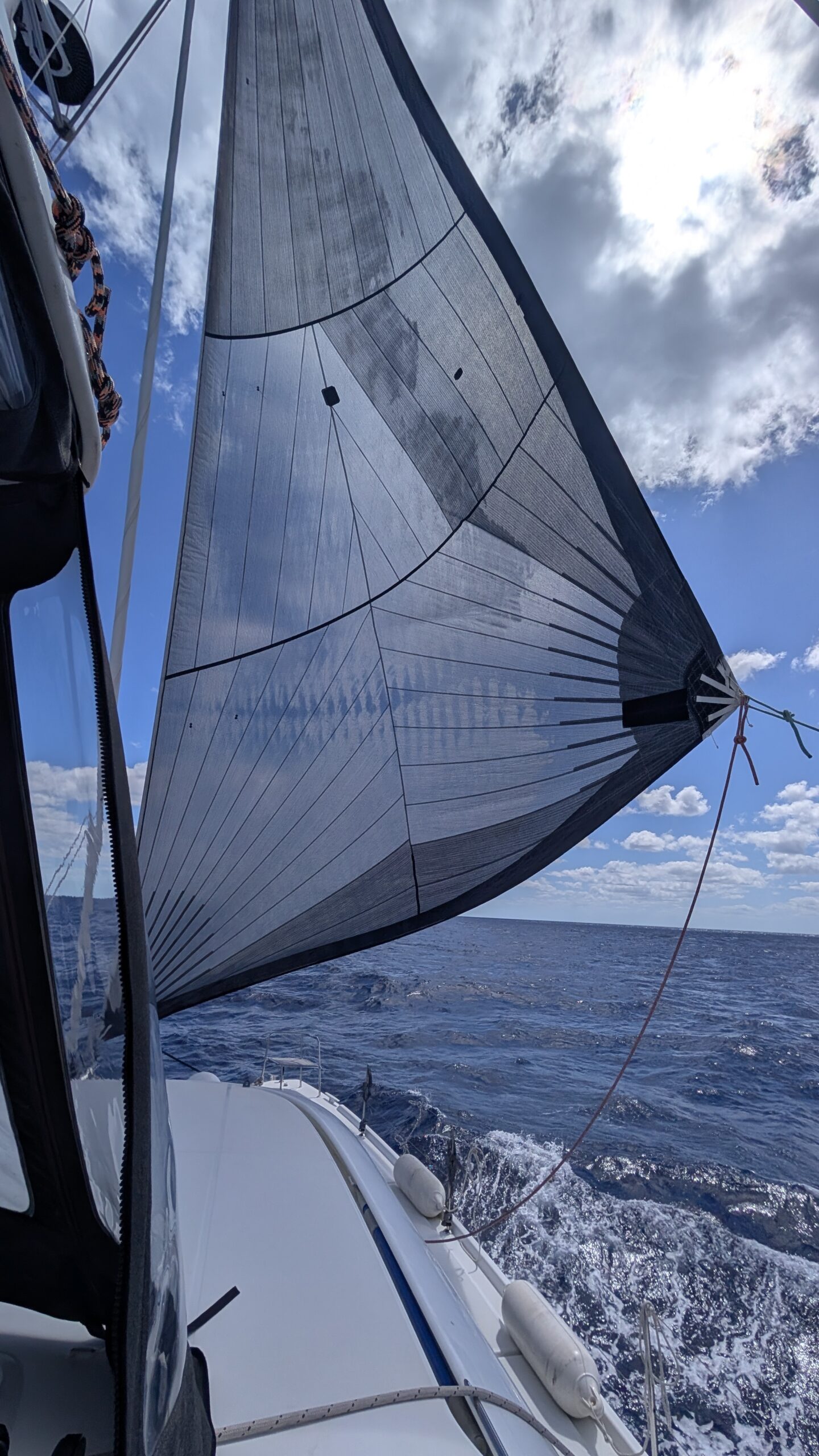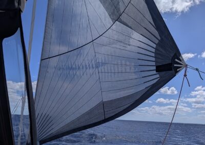 Am Nachmittag nimmt Wind ab und bleibt ruhiger. Um unseren Schnitt zu halten, wechseln wir von der Fock auf den Code-0. Wir können den Schnitt nicht nur halten, er steigt sogar wieder. 😇