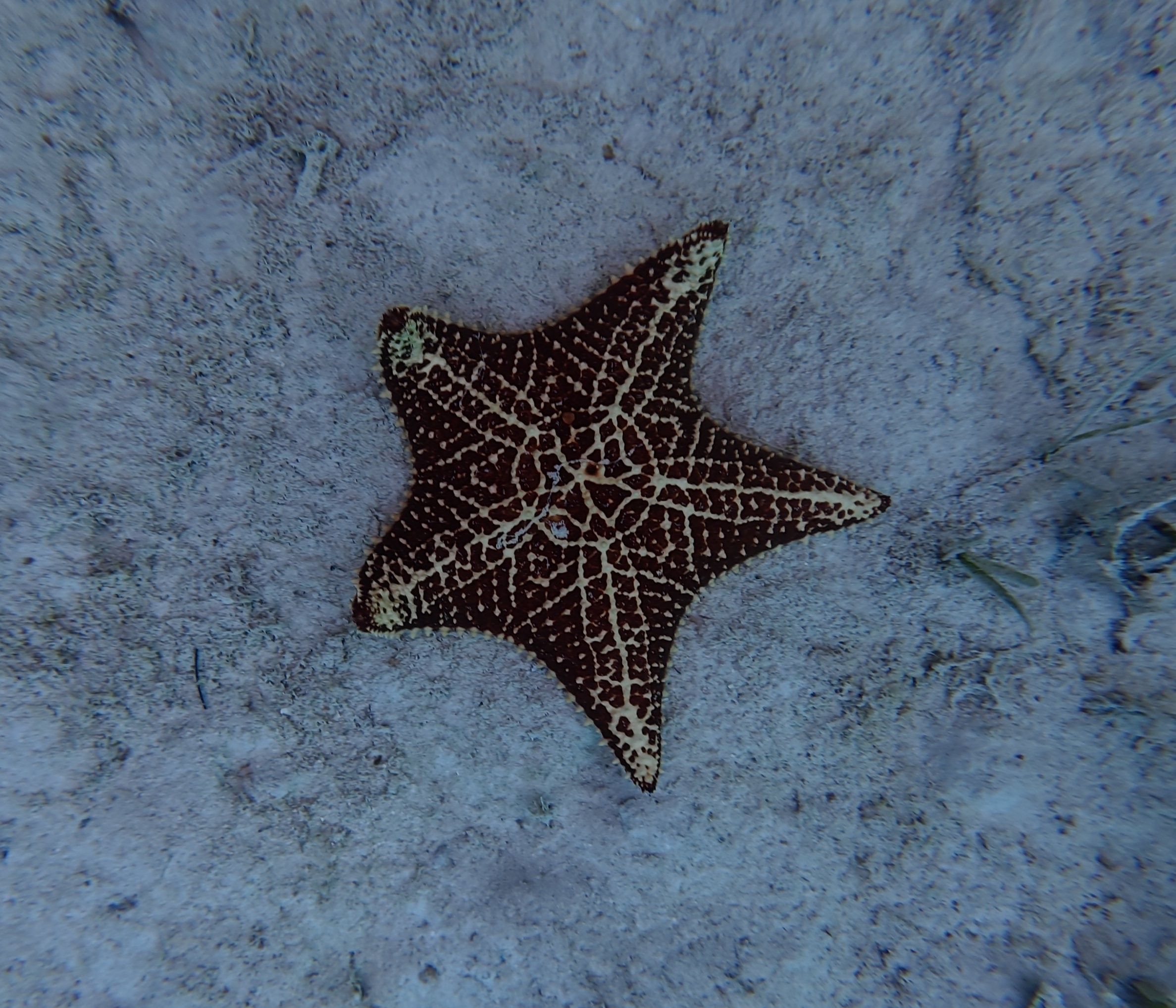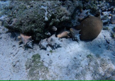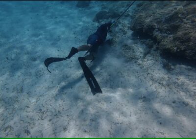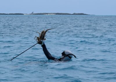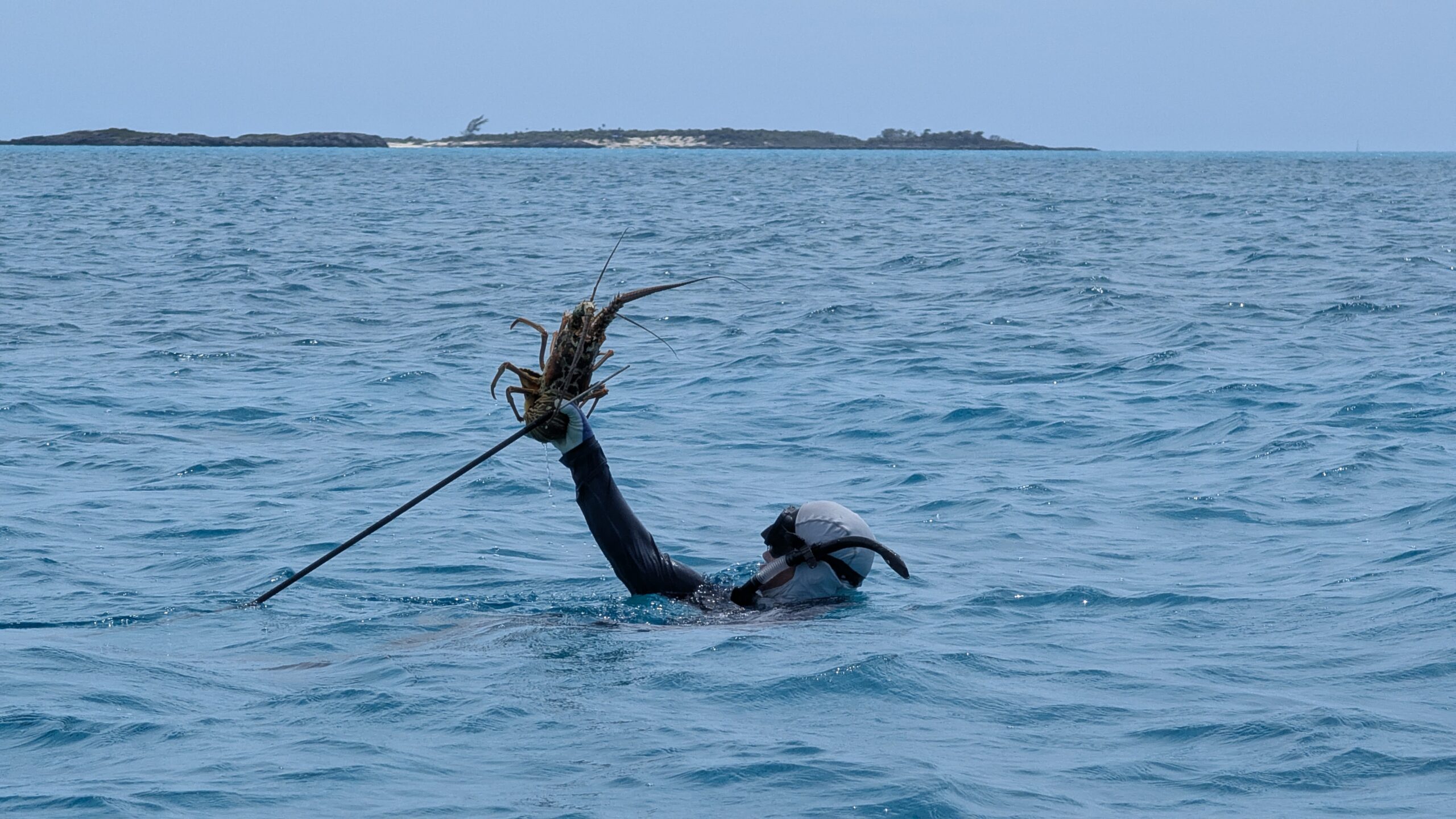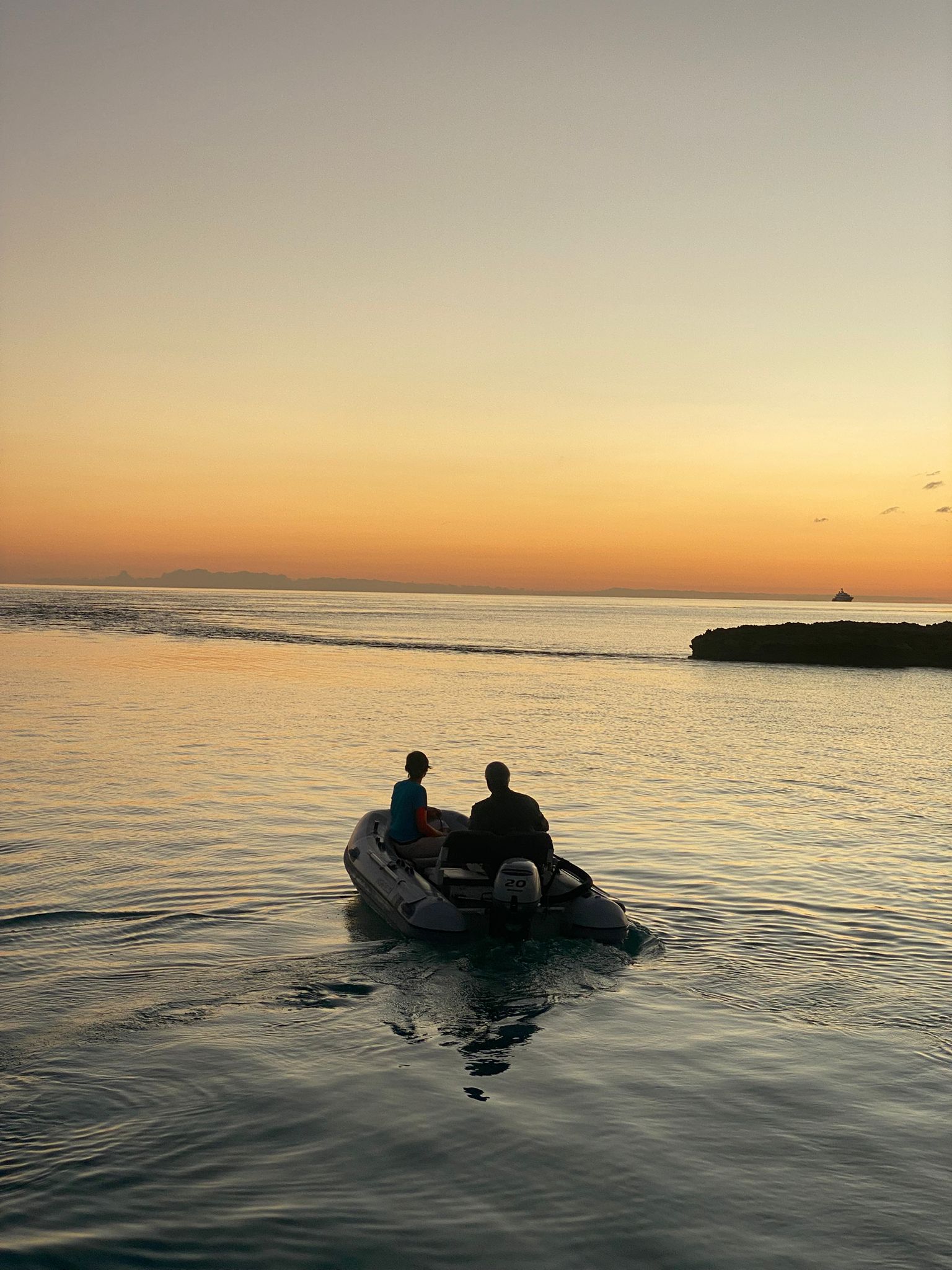 Als sie dann fertig sind gehen wir auf einen kleinen Dinghy-Ausflug mit Rudy Wolfs. Er geht Speer-Fishing, also jagen mit der Harpune. Wir haben weder die Ausrüstung noch ein Fishing-Permit, darum sind wir nur Zuschauer. Aber es ist trotzdem mal spannend. Zum Schluss hat er zwei Feuerfische (Lion-Fish) und einen riesigen Lobster gefangen. 😁