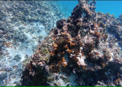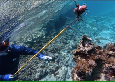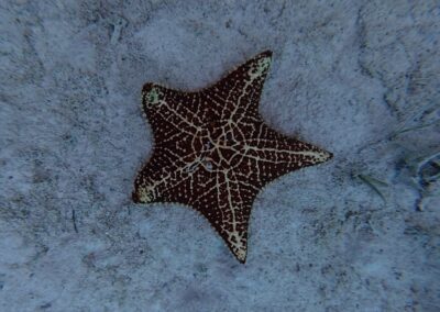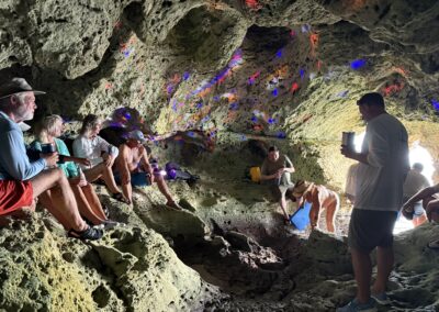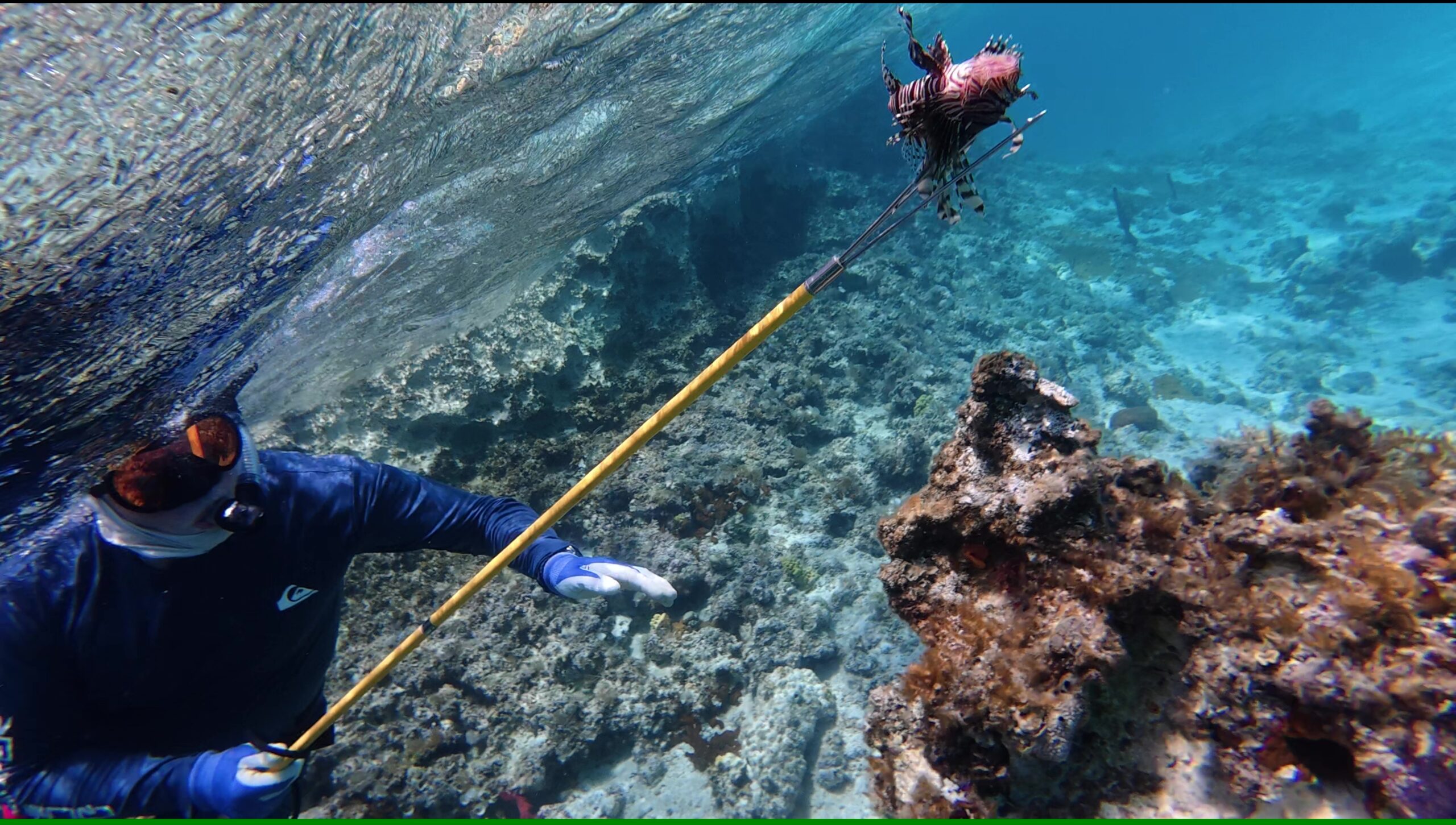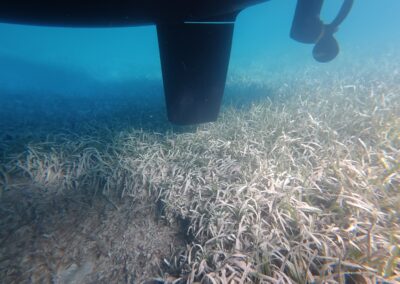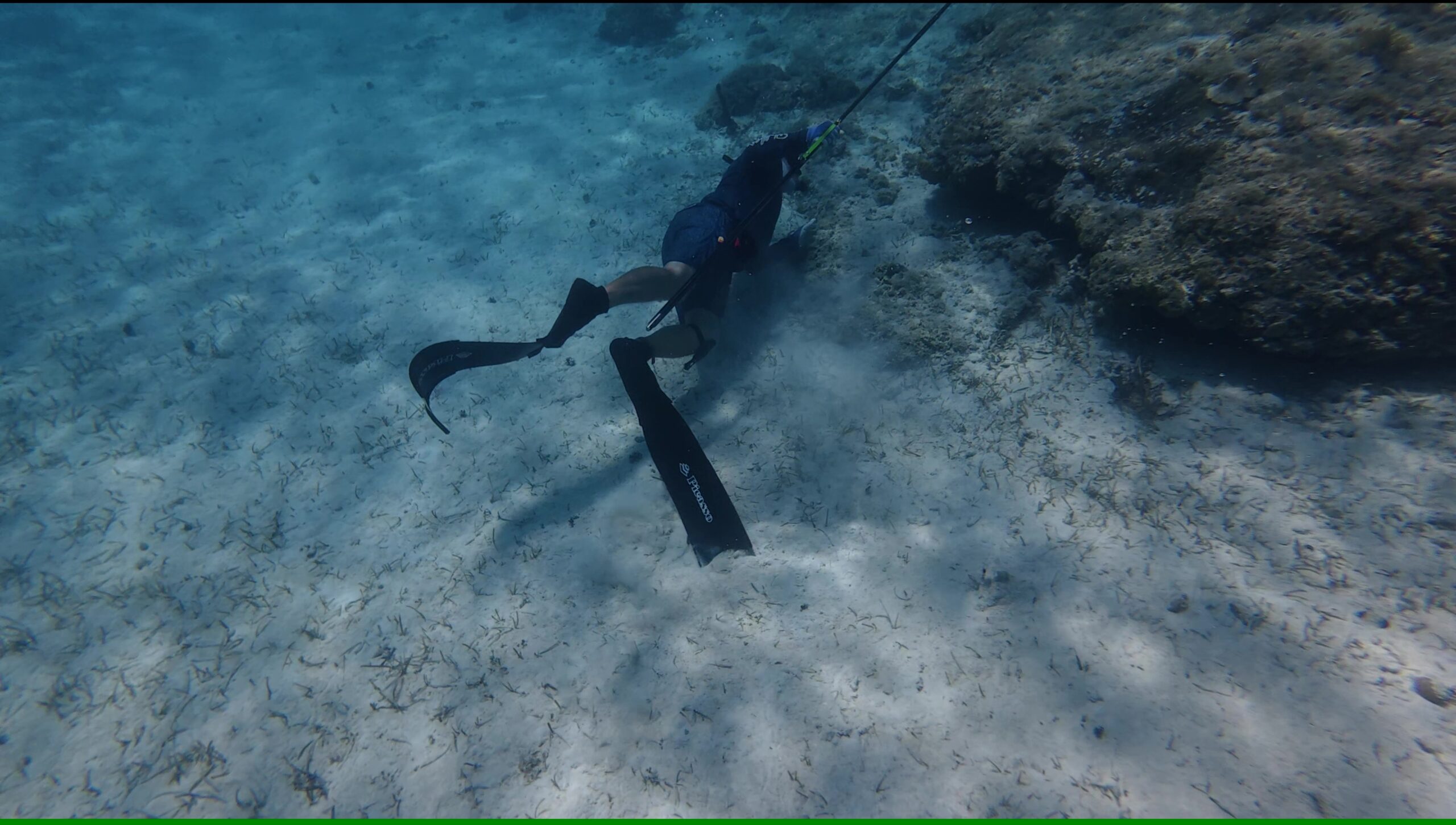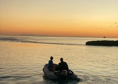 Als sie dann fertig sind gehen wir auf einen kleinen Dinghy-Ausflug mit Rudy Wolfs. Er geht Speer-Fishing, also jagen mit der Harpune. Wir haben weder die Ausrüstung noch ein Fishing-Permit, darum sind wir nur Zuschauer. Aber es ist trotzdem mal spannend. Zum Schluss hat er zwei Feuerfische (Lion-Fish) und einen riesigen Lobster gefangen. 😁