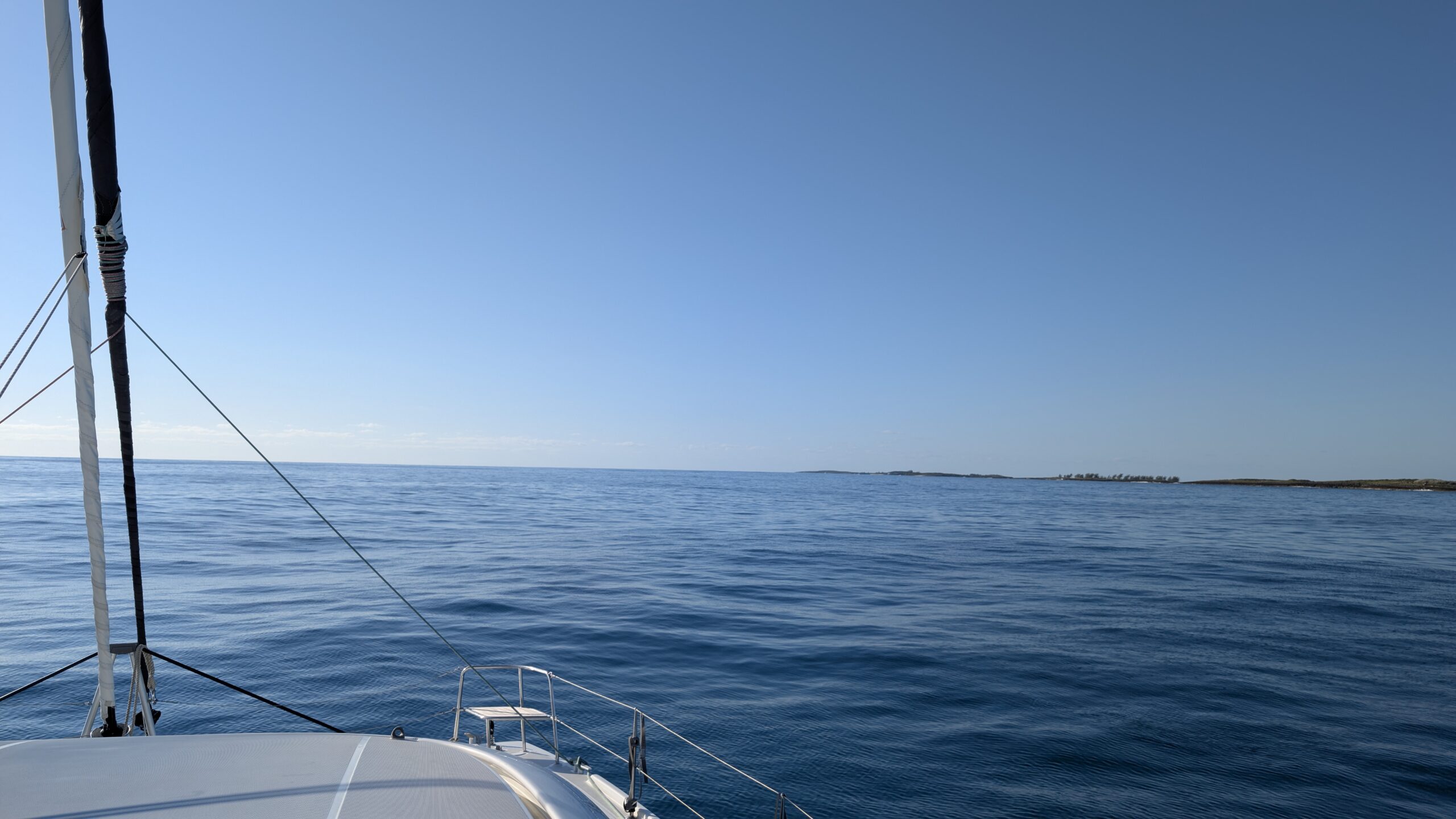 Der Wind hält sich heute auch wieder mit ~5 Knoten zurück, kommt allerdings nicht mehr ganz von vorne. So können wir mit der Fock als Unterstützung noch 0,2 – 0,4 Knoten herausholen.