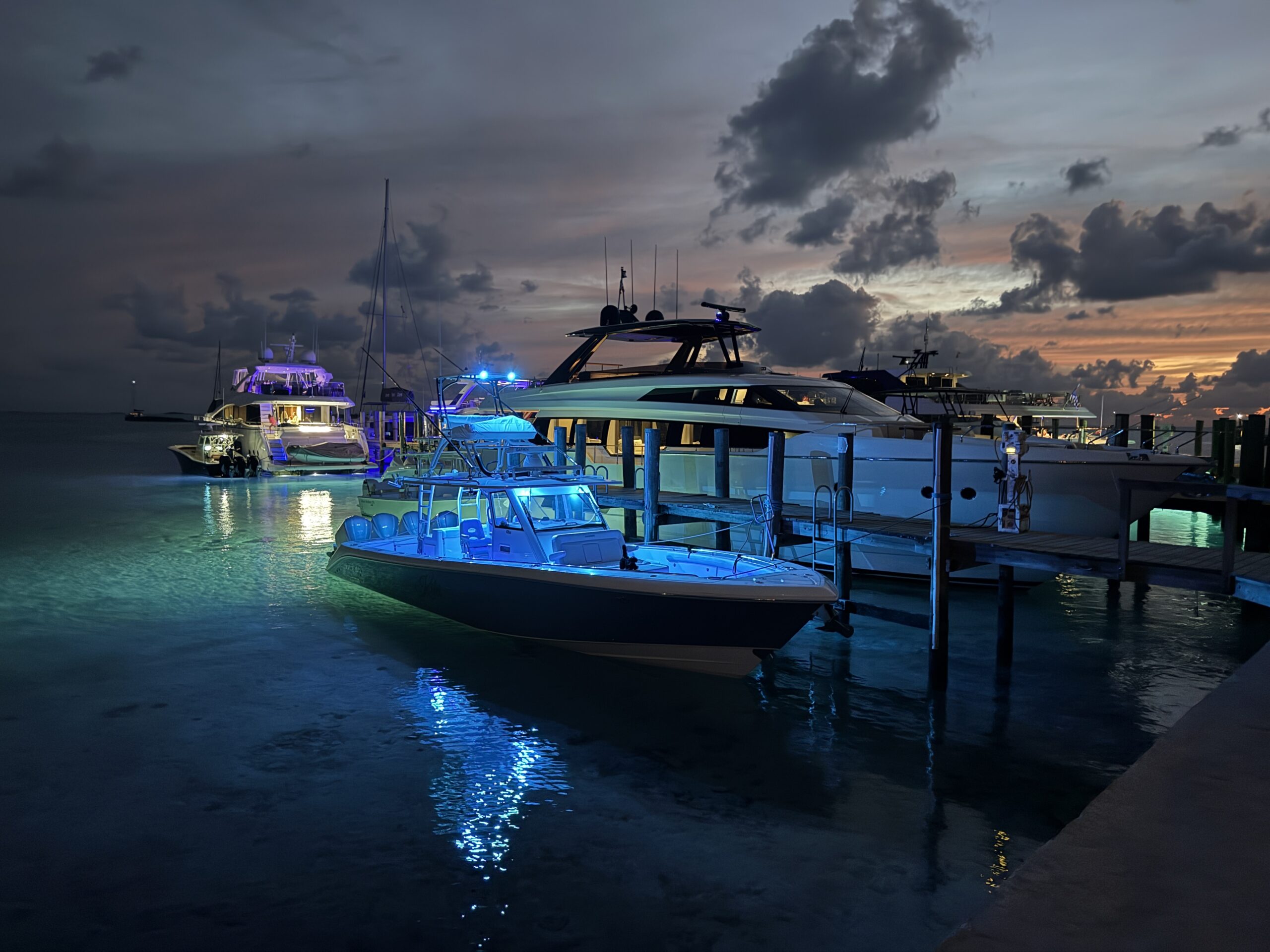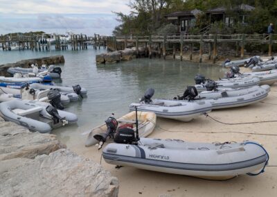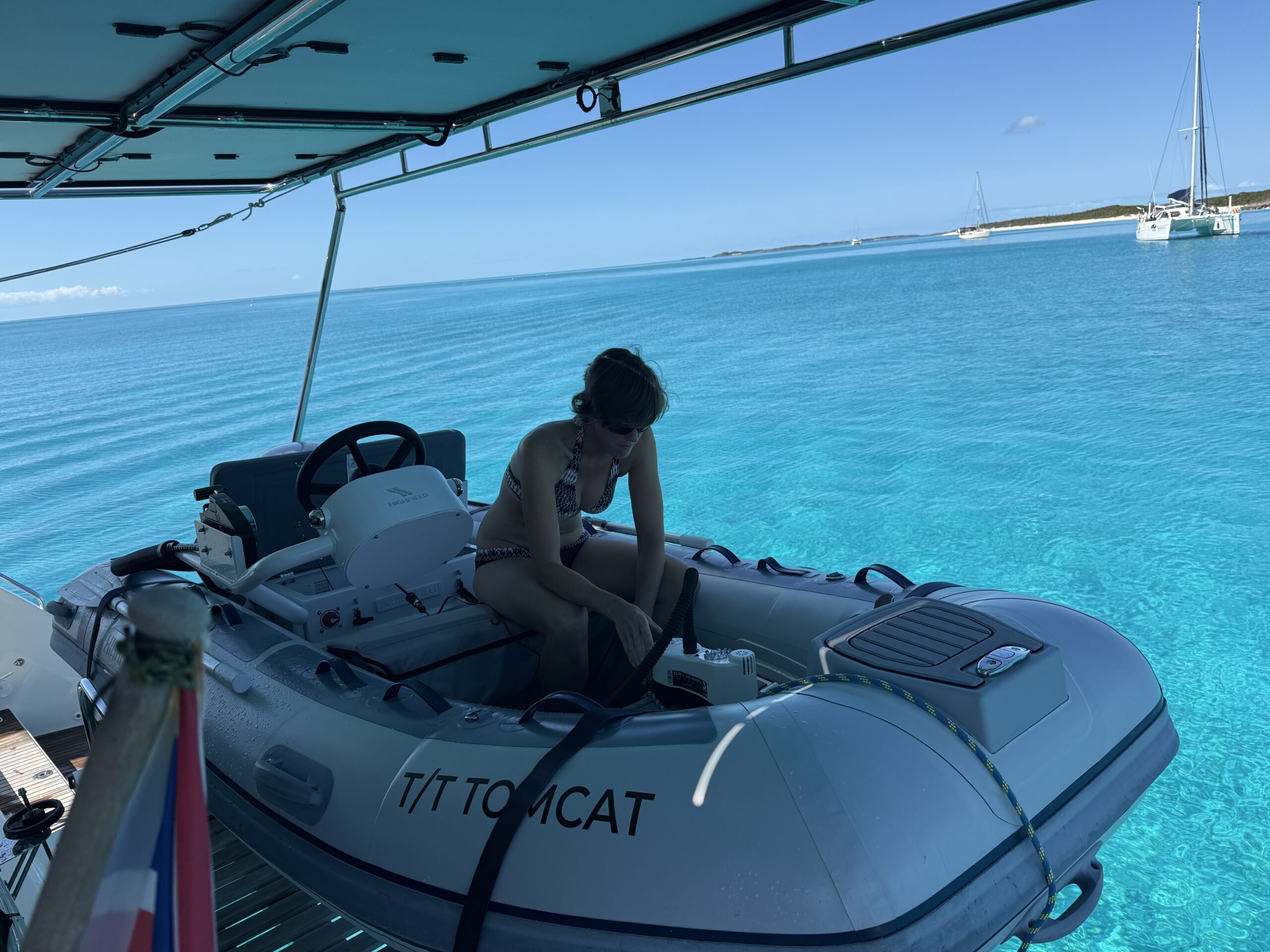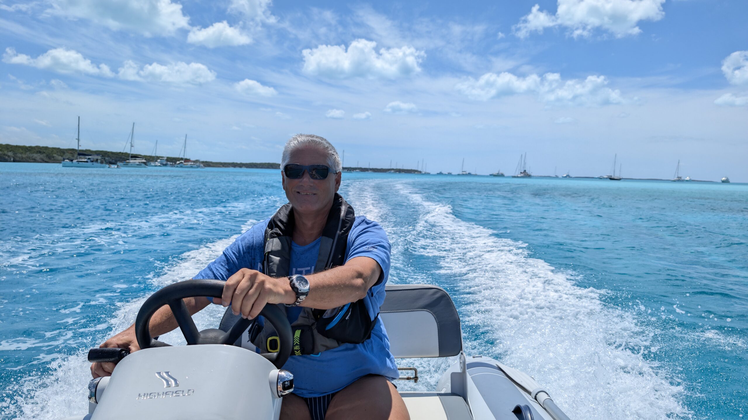 Thomas und ich machen uns um 17:30 Uhr mit dem Dinghy auf den Weg zum Staniel Cay Yacht Club. Trotz Wind und Wellen bleiben wir erstaunlich trocken. 😇