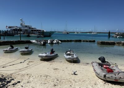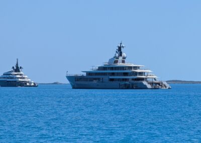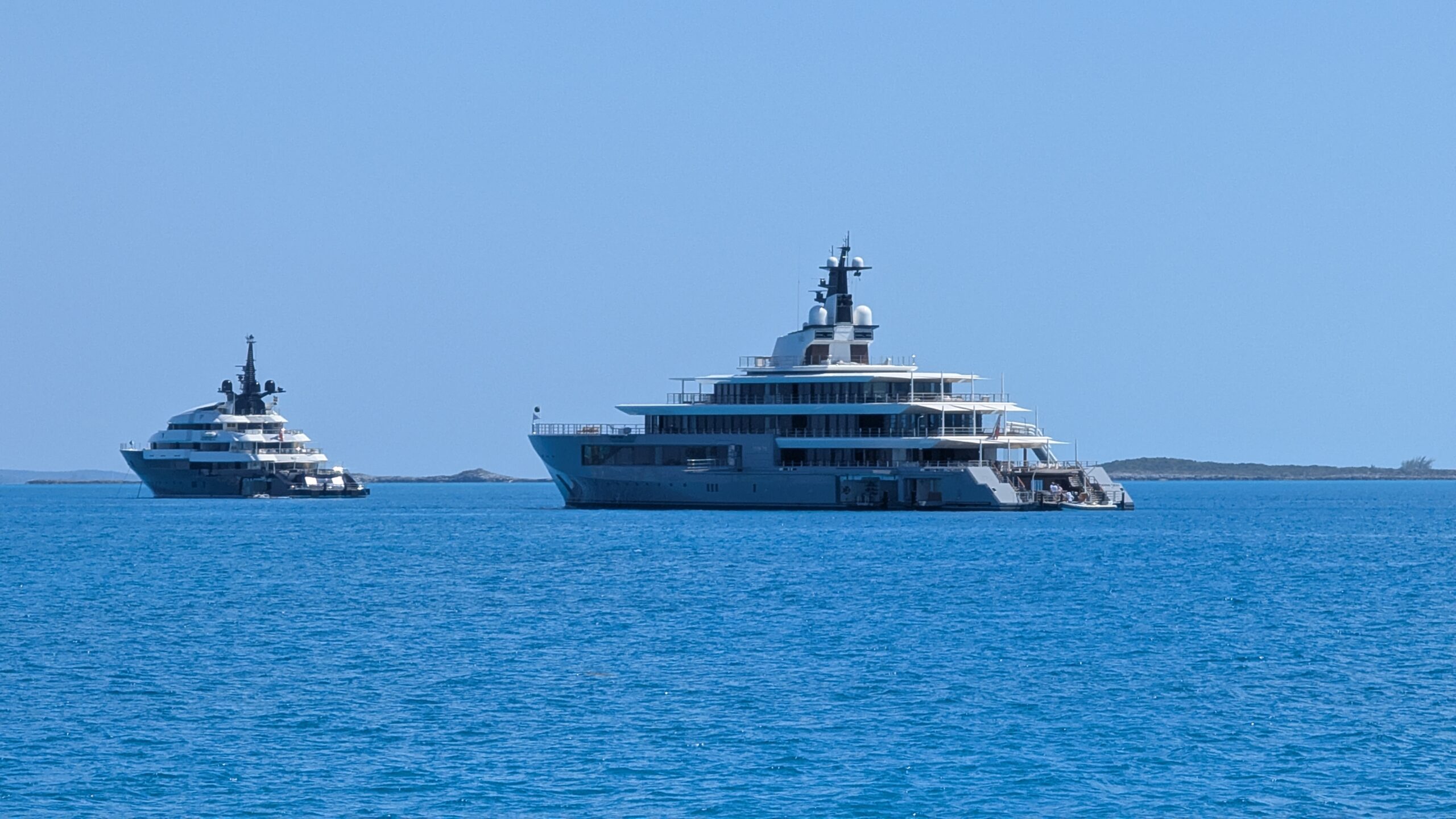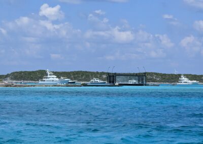 Ca. um 14:30 Uhr nähern wir uns unserem Ziel, Staniel Cay. Quasi auf unserem Weg liegen die beiden Mega-Yachten 7-Seas (Steven Spielberg) und Man of Steel (Barry Zekelman) vor Anker. Wie es scheint haben auch die Superreichen bereits den Weg in die Exumas gefunden.